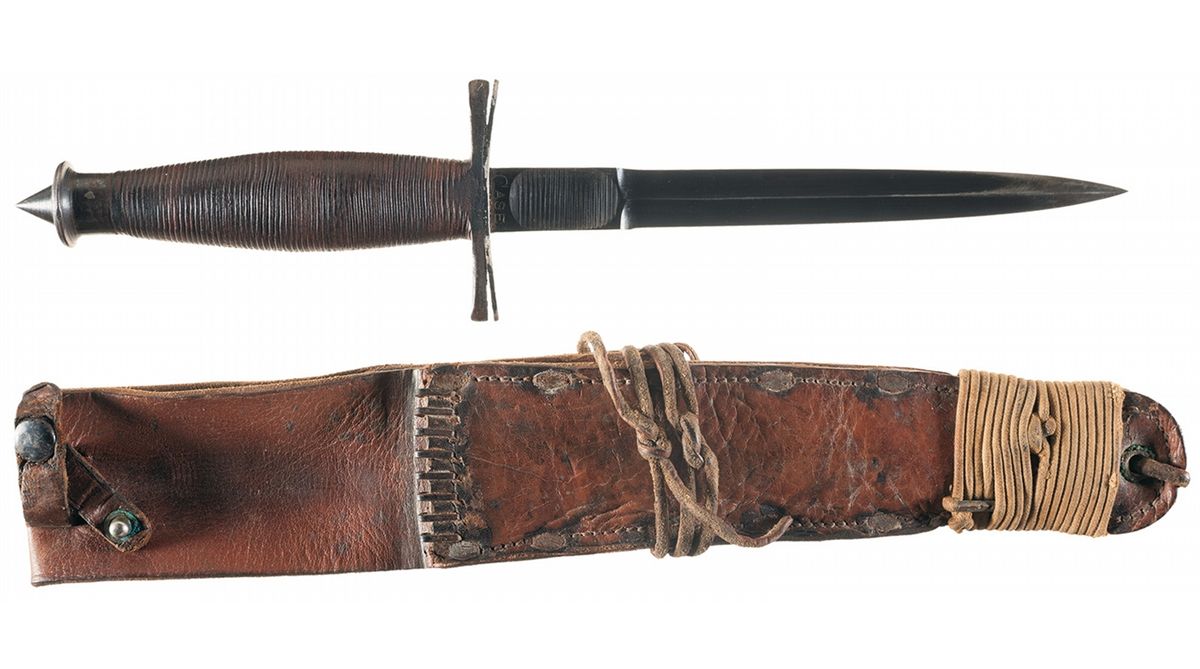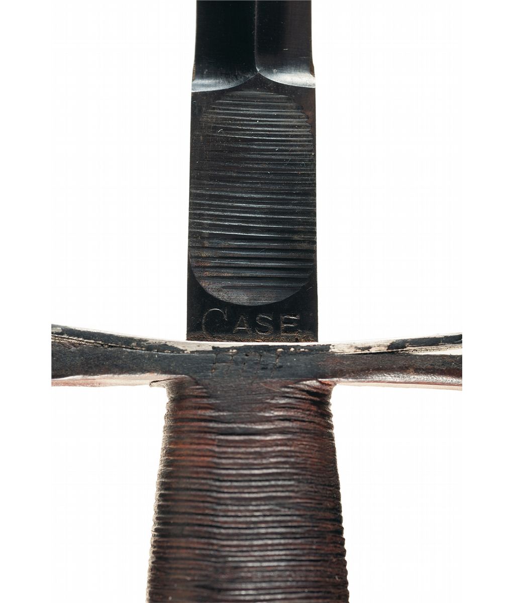 This is an extremely rare and desirable WWII V42 Stiletto produced by the Case Cutlery Company in 1943. These Stiletto's were patterned after the Fairborn-Sikes Commando knives and were issued to "The First Special Services", commonly called "The Devils Brigade". This unit was a composite unit made up of both Canadian and U.S. Army forces trained in Command Warfare. They were the true forerunners of the current Special Forces or Green Berets. There were approximately 3,600 of these knives manufactured and they are characterized by the slender 7 5/16 inch stabbing blade, thumb print below the guard, serrated one-piece leather handle and the steel pointed "Skull Crusher" end cap. The leather scabbard is the long version designed to be worn on the belt, slung down the side and tied to the leg. The scabbard is both sewn around the edges and has 14 steel rivets evenly spaced around the edges. The throat of the scabbard has eight staples across the top and a leather leg tie-down. The name "HILL" is scratched into the handle at the handguard. According to consignor notes that only ten officer's and enlisted men named Hill are on the roster of the Devils Brigade.