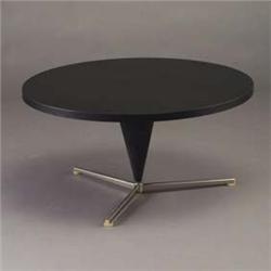 Rare VERNOR PANTON occasional table with circular black laminate top, identical to preceding. Excellent condition. Unmarked. 15 1/2" x 32" dia. $1,500-2,000