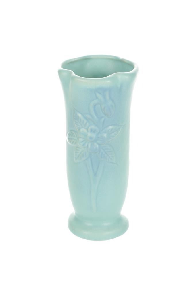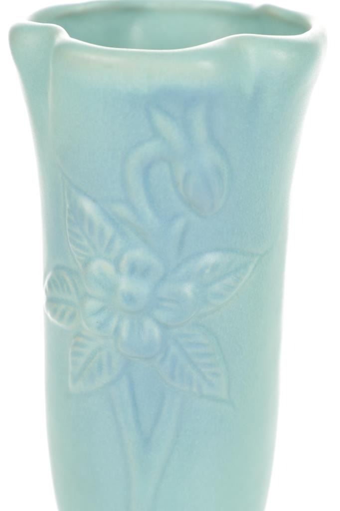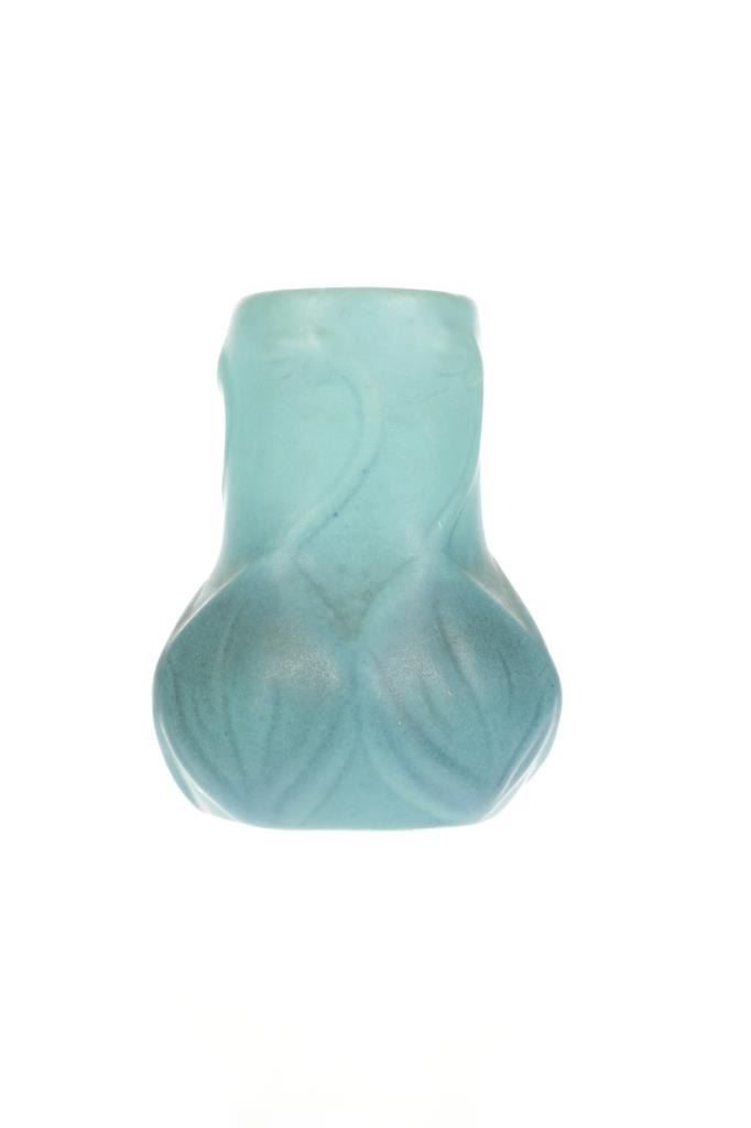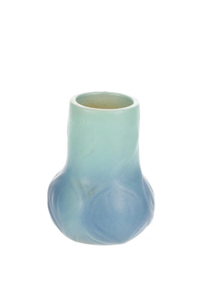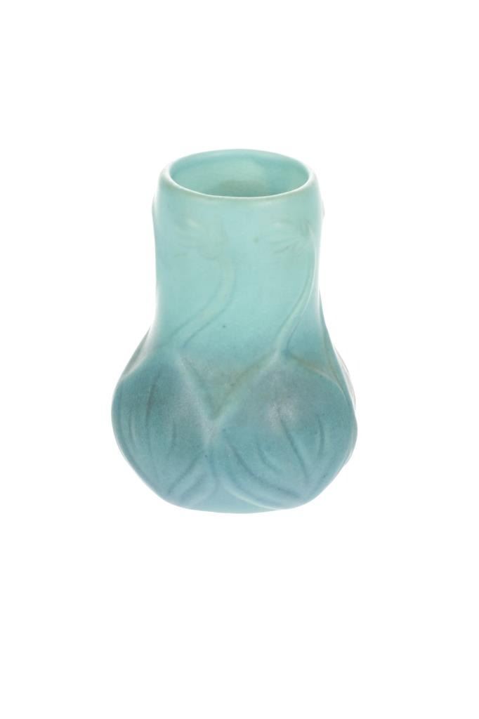 Offered in this lot is a collection of three rare Van Briggle vases. In 1899 Artus Van Briggle stepped off the train in Colorado Springs, though Artus was a brilliant painter, his artistic passions were most famously expressed in one of history’s oldest arts - pottery. The first vase is a pristine Van Briggle vase produced circa 1960. The vase features a stylized rendering of Colorado’s state flower, the Columbine. The vase has a Columbine flower and bud stem on two sides. The vase measures 8 1/2" tall and 3 3/4" across. The next items in the lot are two Onion bulb vases. These Vases are known as a "Onion Bulb" Vase because of the pattern of blooming Onion bulbs around the vase, as well as its shape. The Vases Stand 4 1/4" tall and are 3 3/8" across at the widest point. All these vases are made in one of Van Briggle's most highly collected glazes known as "Turquoise Blue". These vases are in good condition with no obvious signs of damage.