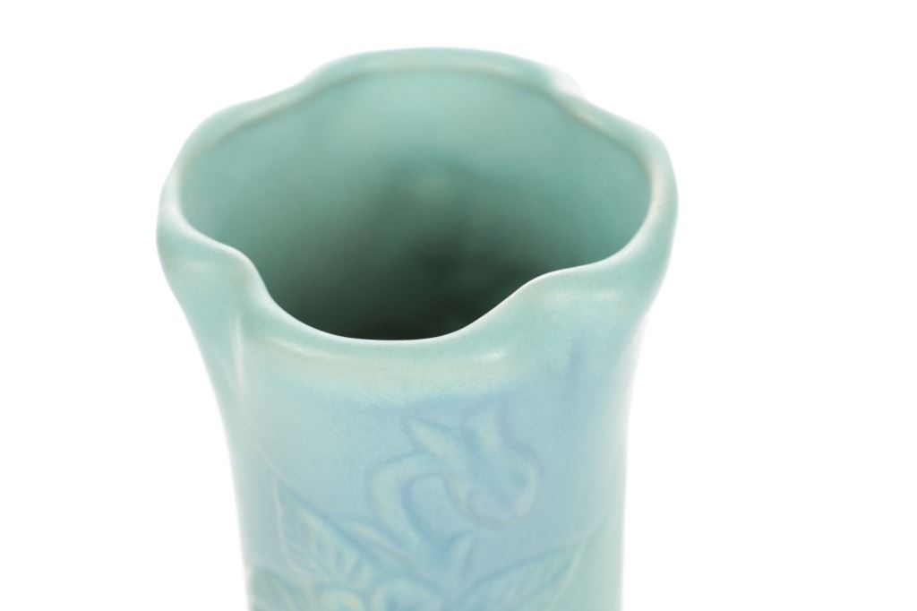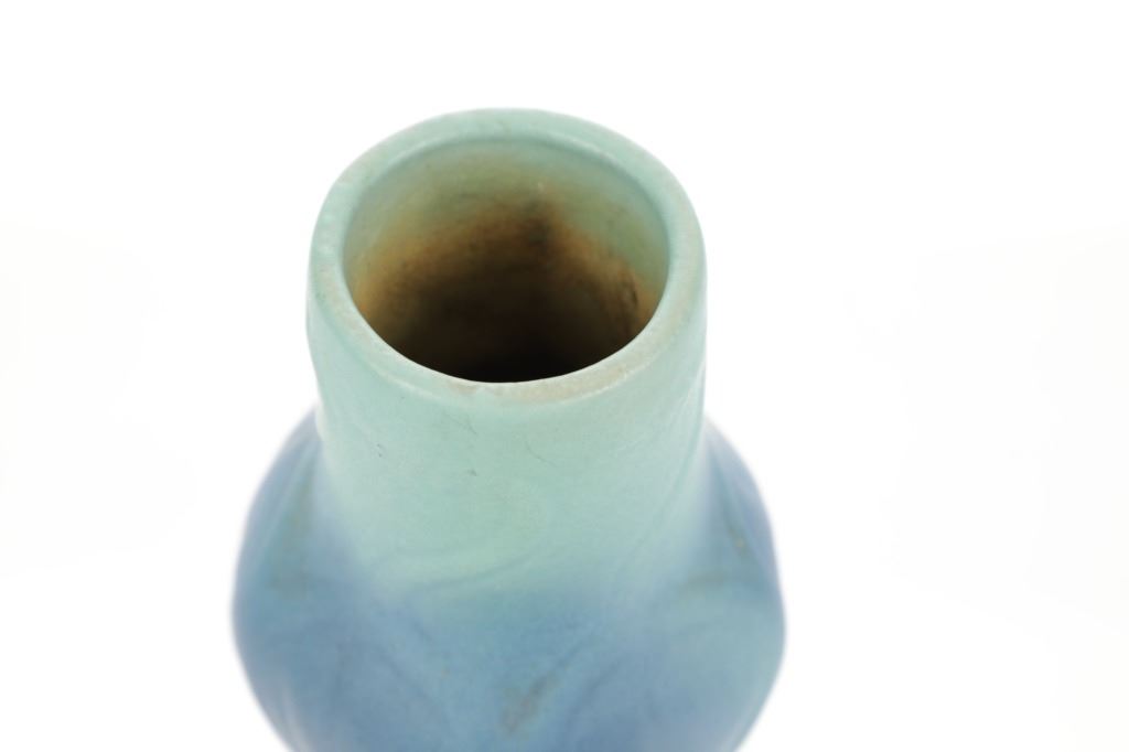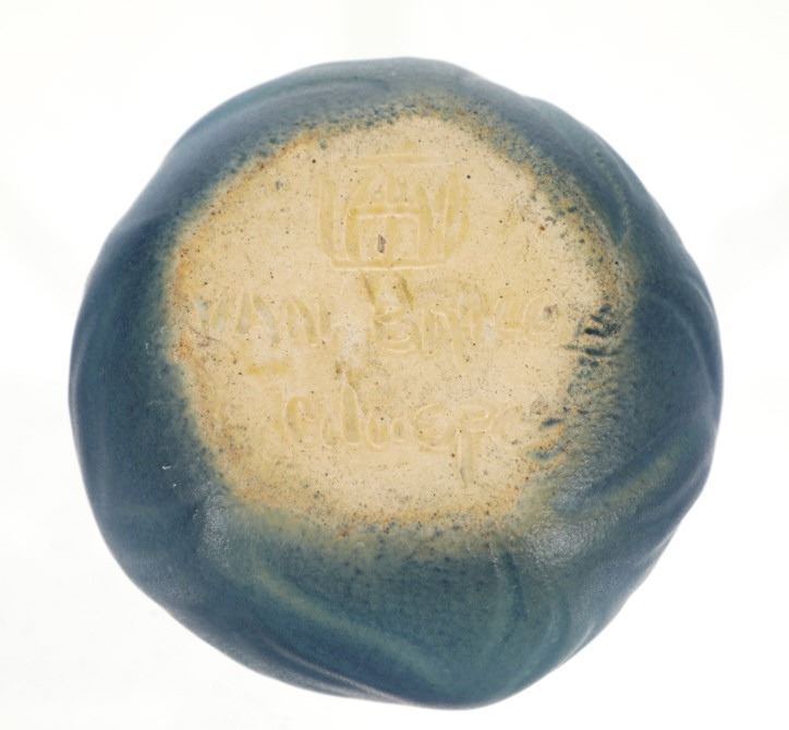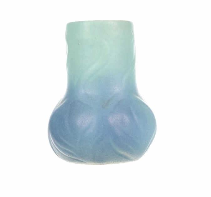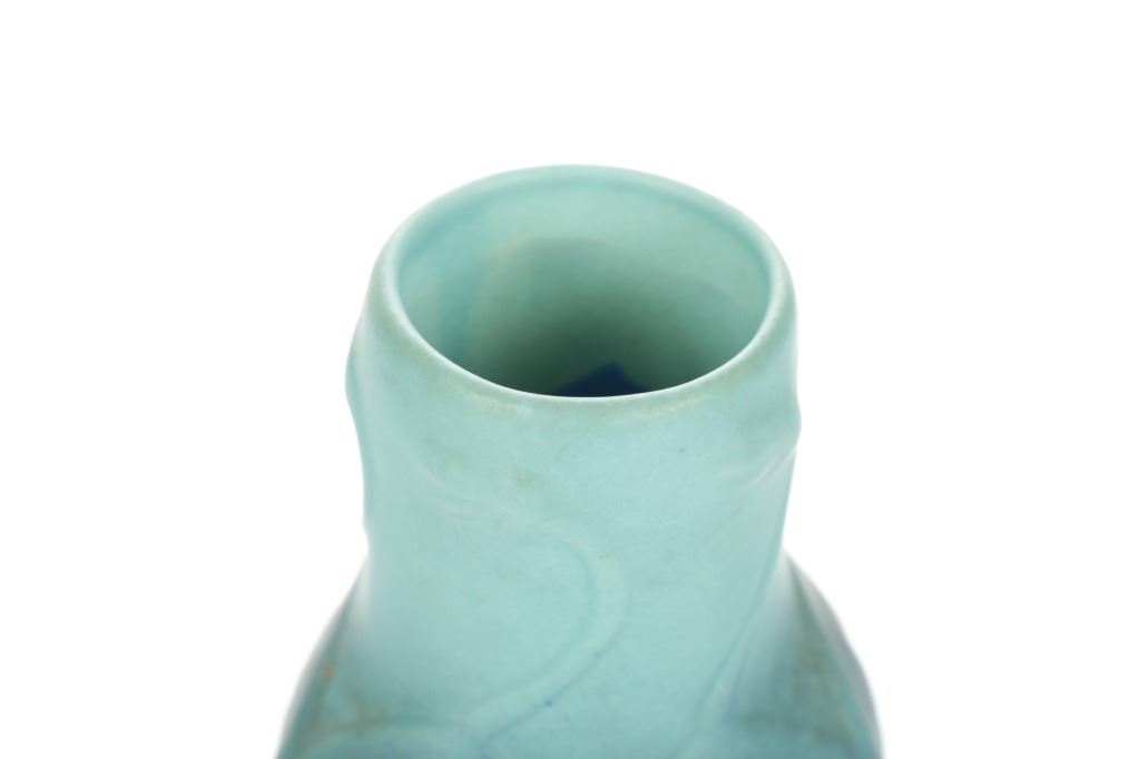 Offered in this lot is a collection of three rare Van Briggle vases. In 1899 Artus Van Briggle stepped off the train in Colorado Springs, though Artus was a brilliant painter, his artistic passions were most famously expressed in one of history’s oldest arts - pottery. The first vase is a pristine Van Briggle vase produced circa 1960. The vase features a stylized rendering of Colorado’s state flower, the Columbine. The vase has a Columbine flower and bud stem on two sides. The vase measures 8 1/2" tall and 3 3/4" across. The next items in the lot are two Onion bulb vases. These Vases are known as a "Onion Bulb" Vase because of the pattern of blooming Onion bulbs around the vase, as well as its shape. The Vases Stand 4 1/4" tall and are 3 3/8" across at the widest point. All these vases are made in one of Van Briggle's most highly collected glazes known as "Turquoise Blue". These vases are in good condition with no obvious signs of damage.