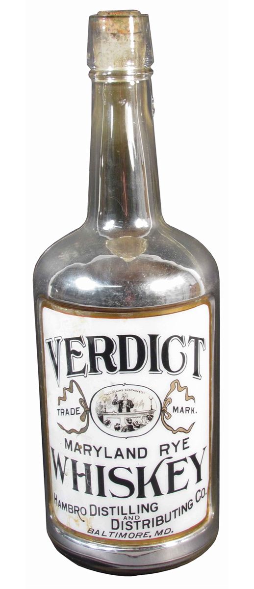 Rare Verdict Whiskey Back Bar Display Bottle. Maryland Rye Whiskey. Hambro Distilling & Distributing Co. Baltimore. This is the only we have ever seen. Minor discoloration on label otherwise very good condition. 17 inches tall.