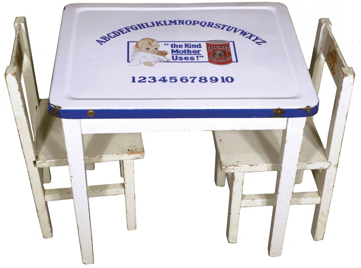 Rare Version Childs Table and Chairs, advertising Calumet Baking Powder. Porcelain top, wood frame and chairs. Some minor wear to corners of table and normal wear to chairs otherwise very good condition. 20 X 16 X 18 inches tall. Start Price $100