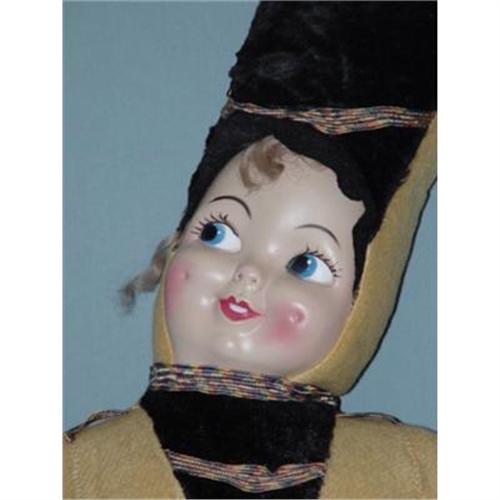 Rare 1940'S Vintage Gigantic 32" Majorette w/ Googlie Eyes. This beauty is made of cloth body and vinyl mask face. Her highly detailed majorette costume is made of felt. She has rosy cheeks and impish smile to go with her googlie eyes. She is in very good condition.