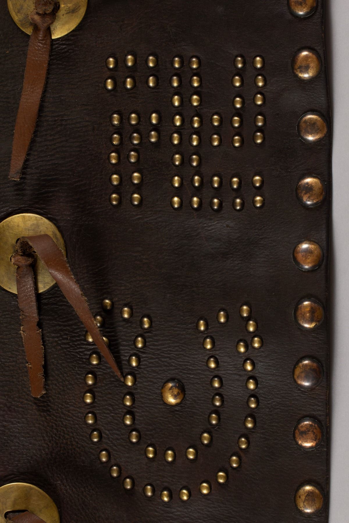 An extraordinary piece of early 20th-century Western Americana, this pair of custom-made chaps represents the pinnacle of craftsmanship from the legendary saddlery, Hamley & Co., of Pendleton, Oregon. This is not a standard offering, but a unique commission, evident in its highly specialized design details. The leg panels are adorned with intricate studded designs, suggesting a custom order for a rider in or with strong ties to the New Mexico territory. This pair is particularly significant for its incorporation of the pre-WWII "whirling log" symbol, a Native American motif that was later abandoned due to its appropriation by the Nazi party. This symbol makes the chaps a true historical artifact, dating them to a specific and meaningful period of American Western history. Stamped "HAMLEY & CO, PENDLETON, ORE," these chaps carry the prestigious mark of one of the most respected saddle and leather goods makers in the American West.
