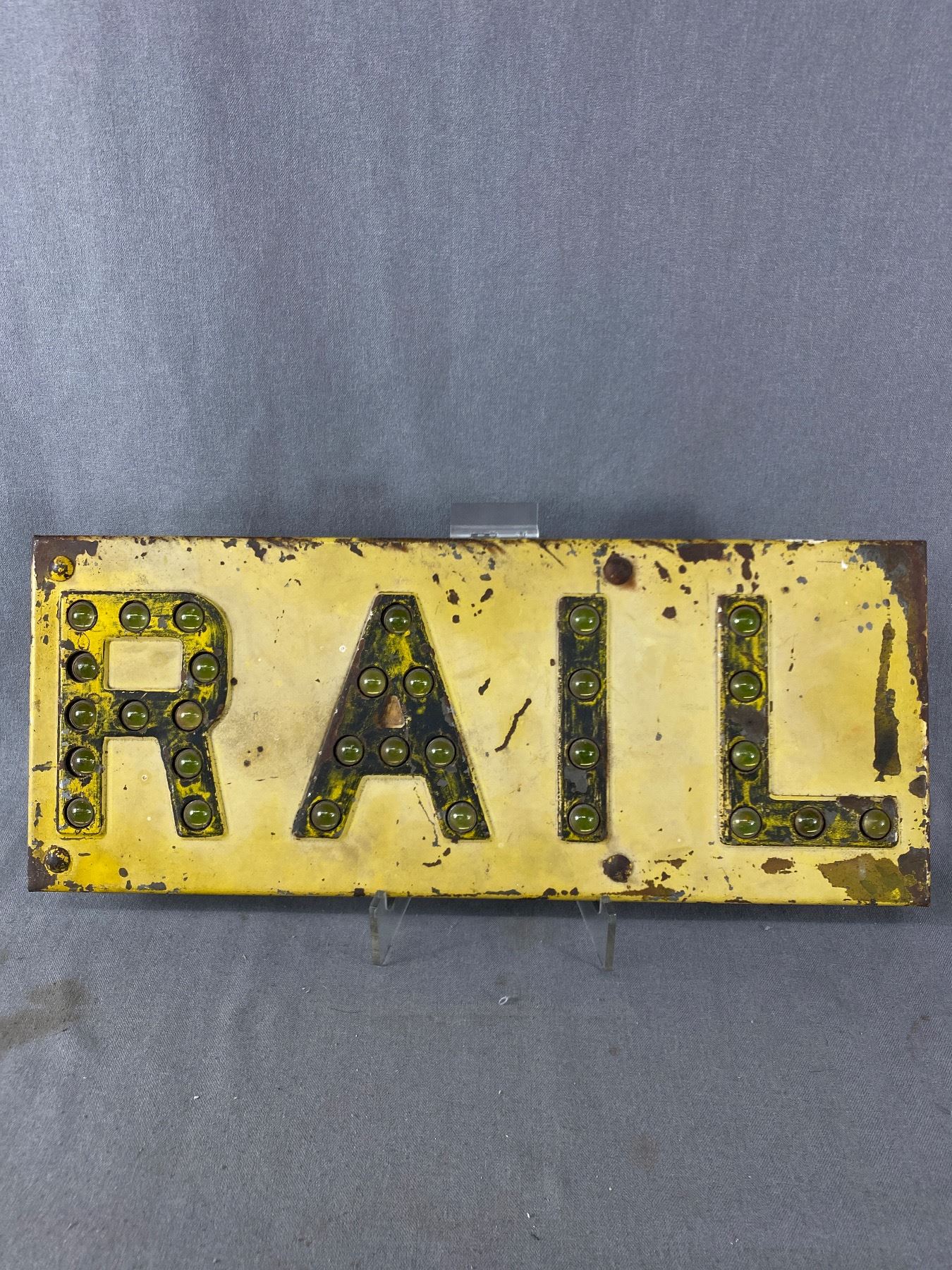 Rare Vintage Metal Rail Sign w/ Yellow Green Marble Reflectors. Approx. 20" x 8"