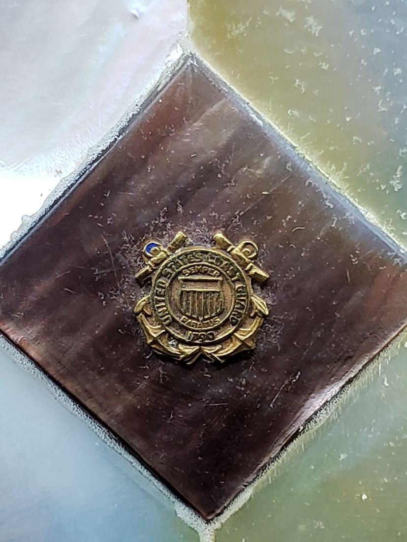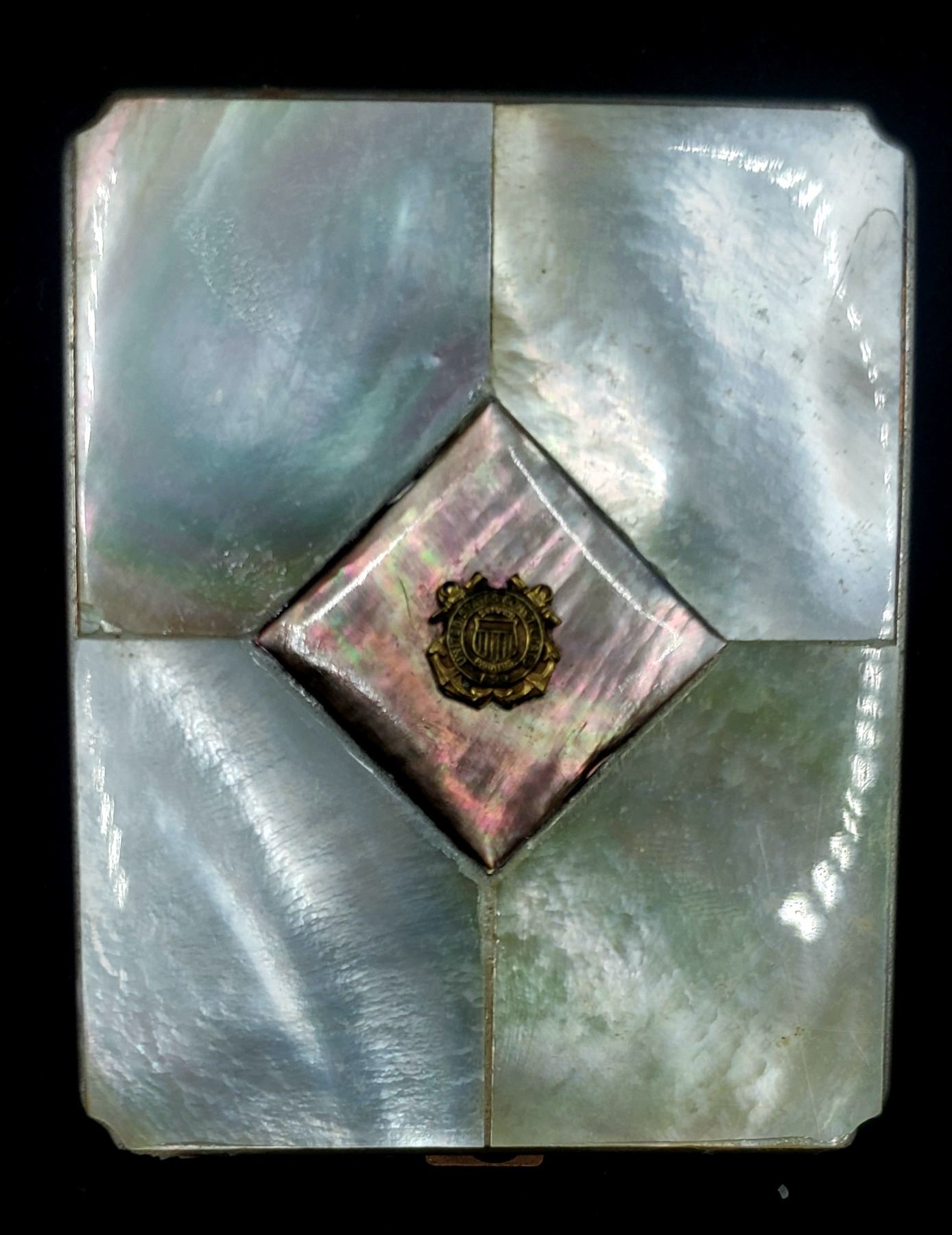 This vintage antique is designed with pearlescent inlayed abalogne and US Coast Guard 1790 Insignia. Comes with original powder puff and unbroken mirror.