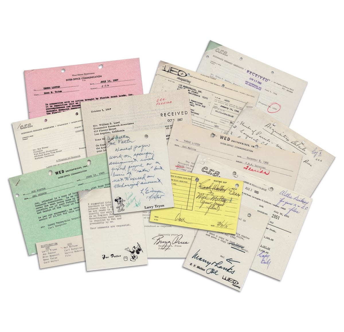 (WED, 1965-67) Facinating group of documents from the desk of WED Enterprises President, Mel Melton. Perhaps no other Walt Disney project provides more mystery, speculation and simple fascination than the far-reaching plans of the mysterious, ”Project X’”. “The Florida Project” was the public working title of the development, which eventually became known as Walt Disney World. Even though the Magic Kingdom theme park grew to become the cornerstone, Walt’s original concept for the “Experimental Prototype Community Of Tomorrow” was actually what the Florida land acquisition was all about. WED Enterprises in Glendale, California re-engaged their colleagues in project development, Economic Research Associates to study everything from market research, population growth, legislative opportunities, Government assistance, alternative financing and tourist projections. Just as they had done in 1953-4 for Disneyland, Harrison Price and William Lund worked in tandem with the execs at WED to find the best solutions to maximize their plans for “Project X”. This file, (55) pages in all, covers the engagement of E.R.A. and correspondence within and outside of WED Enterprises. The file begins in early 1965 and continues through 1967. Many of the now legendary names of the WED brain-trust are mentioned and/or are directly related to documents in this file. Filled with concepts, mission statements, budgets, invoices, status reports, inter-office memos and personal notes, the file gives a fascinating glimpse behind the scenes at WED Enterprises in this most exciting period of its history. Many key figures are represented here with signatures including, Mel Melton, Donn Tatum, Ken Moline, Joe Potter, William Lund, Larry Tryon, Willie Disbrow and Harrison Price. More names are mentioned and/or directly corresponded through including Walt’s brother, Roy. During the time period covered in this file, Walt ends his involvement with the New York World’s Fair, re-invigorates Disneyland and finally engages an ambitious plan for the future before his tragic death in late 1966. No project so encompasses the totality of Walt’s career than “Project X” and his plans for E.P.C.O.T. Documents such as this remind us that his venture in Central Florida was more than a cheesy tagline about “one man’s dream”, but rather a concrete vision of the future he fully intended to bring to reality.