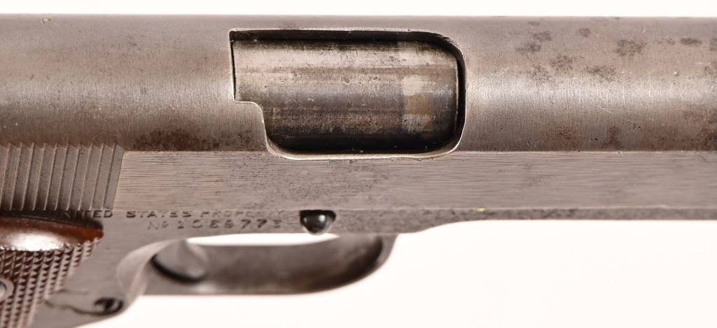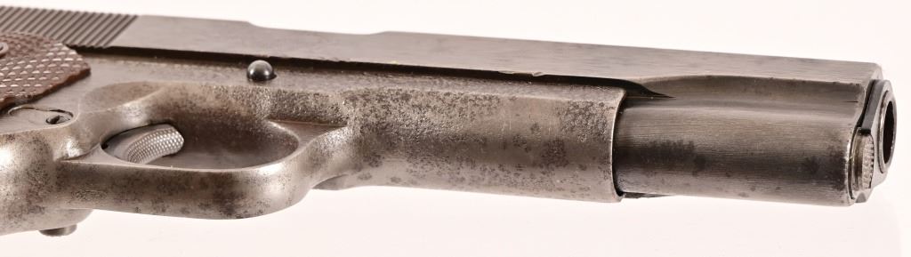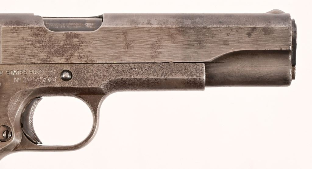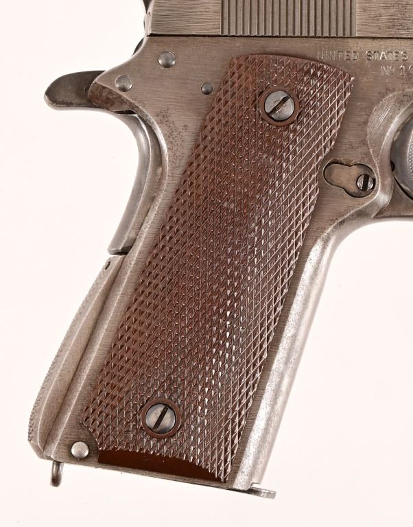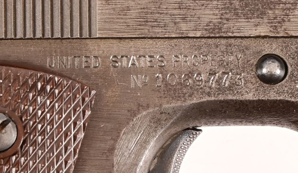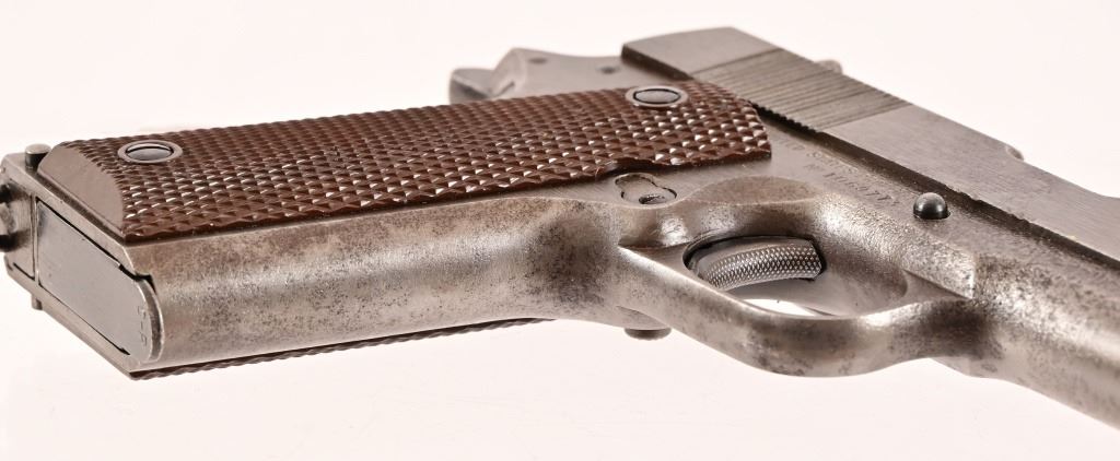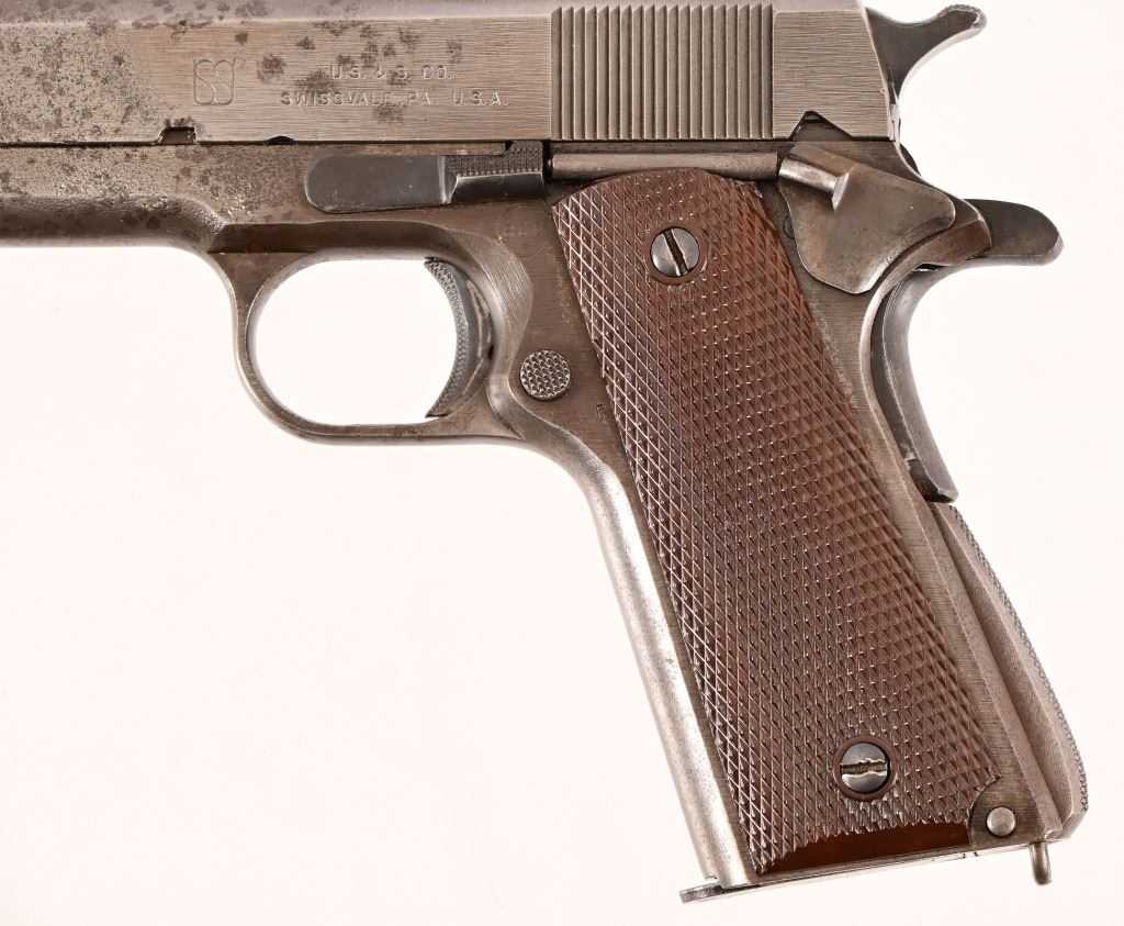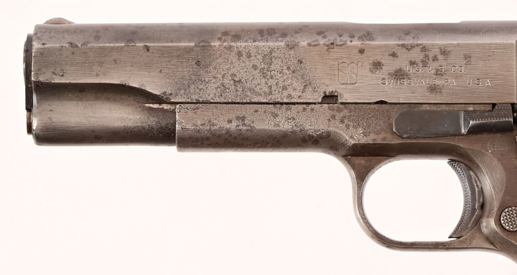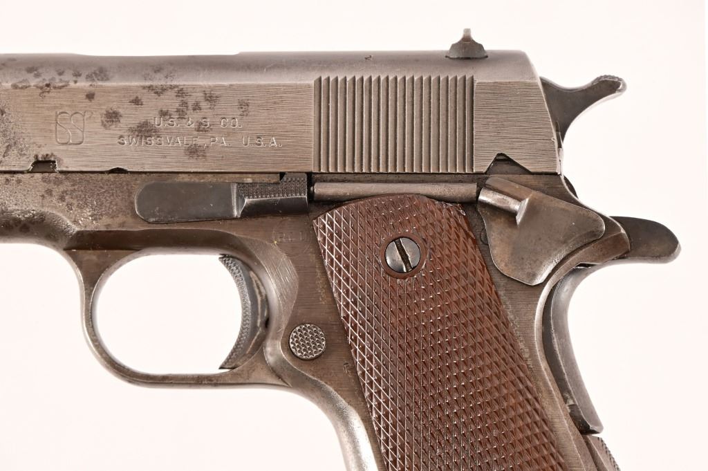 S/N 1069773, Manufactured in 1943. Union Switch & Signal ( US&S Co. ) manufactured M1911A1 pistols with serial numbers ranging from 1041405 - 1096404, A total of 55,000 pistols were produced by US&S during World War II. These pistols are the second rarest of the M1911A1s produced, next to the Singer Sewing Machine Co. 5" barrel, bore is frosted but with good rifling. Right side of frame is marked "United States Property, U.S. Army". R.C.D. inspection mark on left side of frame. Slide has USS logo and S & S. Co., Swissvale PA, USA. Gun retains approximately 50% of metal finish. There are areas of erosion on frame and slide. Magazine is marked "C R" for Colt - Risdon. Grips are correct type although may be replacements. Modern.