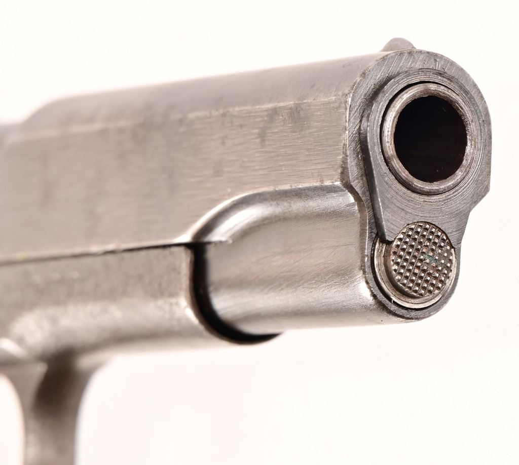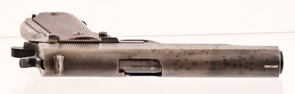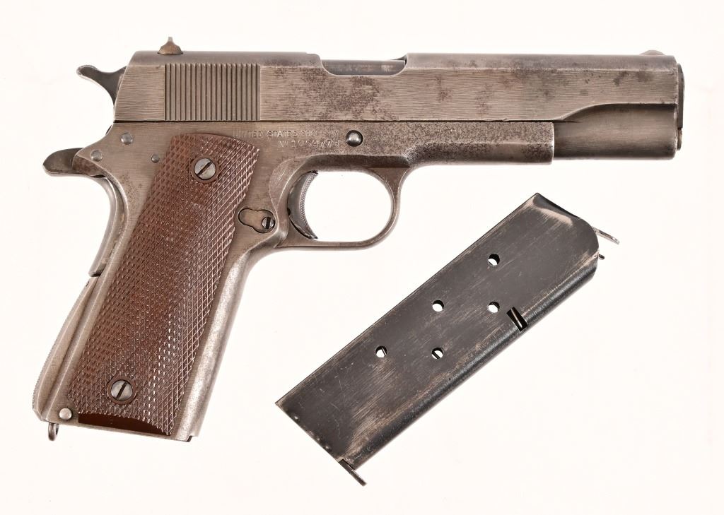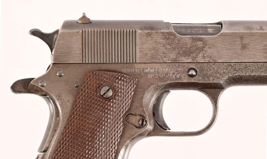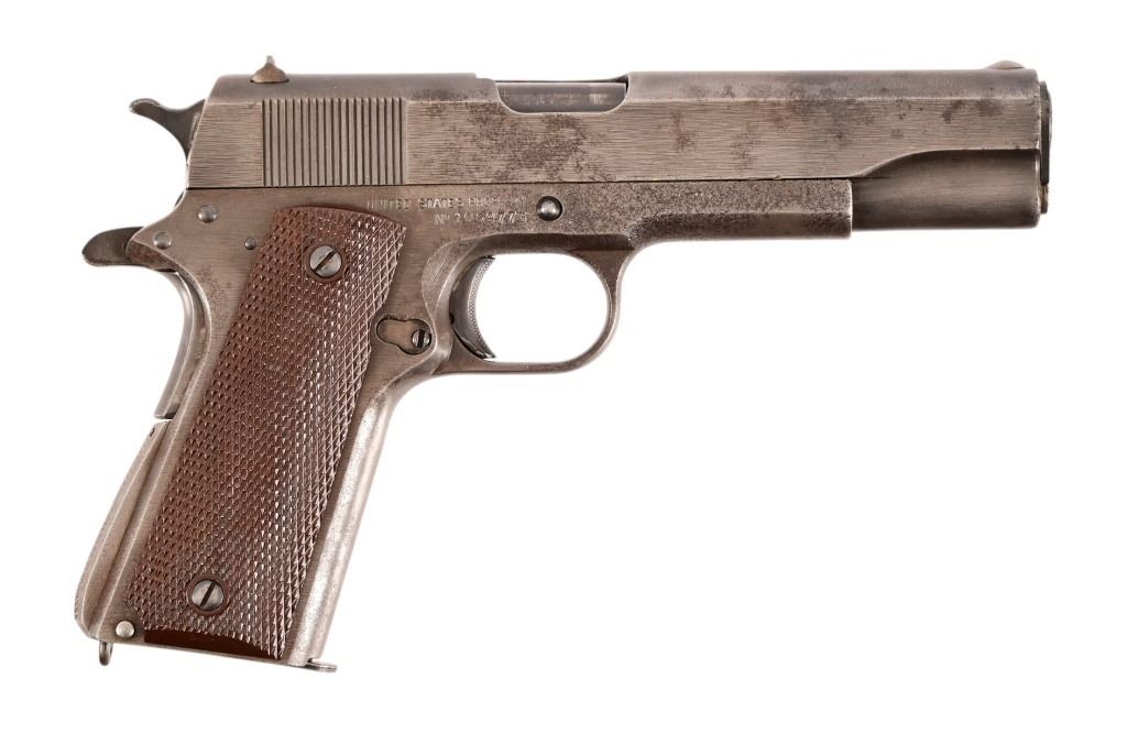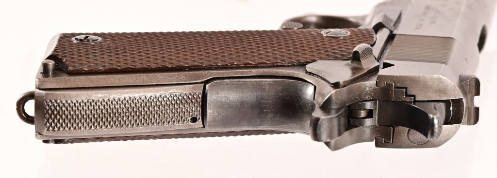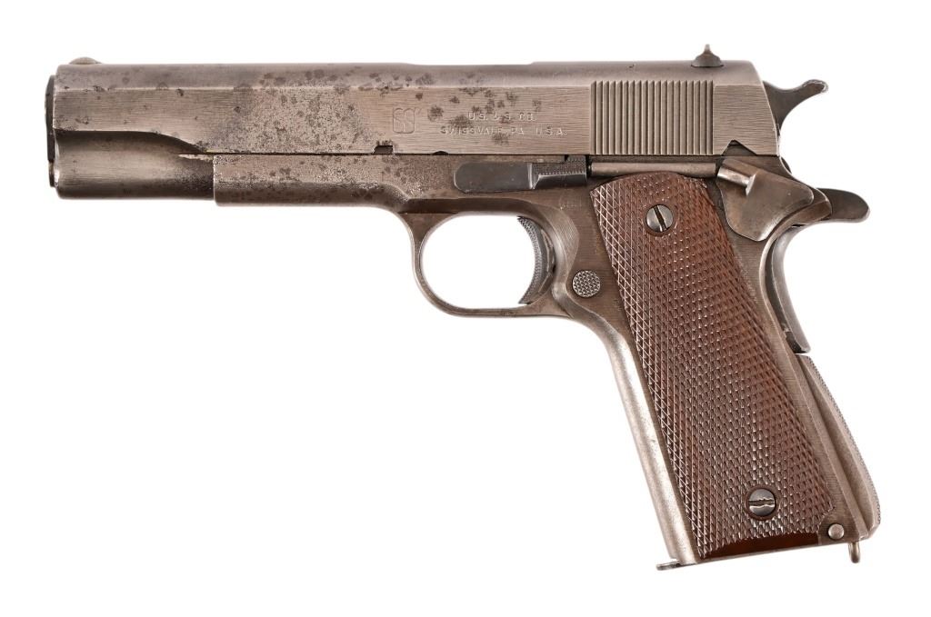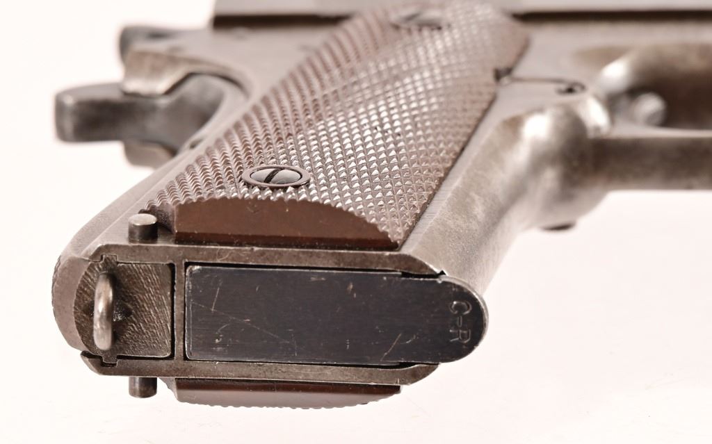 S/N 1069773, Manufactured in 1943. Union Switch & Signal ( US&S Co. ) manufactured M1911A1 pistols with serial numbers ranging from 1041405 - 1096404, A total of 55,000 pistols were produced by US&S during World War II. These pistols are the second rarest of the M1911A1s produced, next to the Singer Sewing Machine Co. 5" barrel, bore is frosted but with good rifling. Right side of frame is marked "United States Property, U.S. Army". R.C.D. inspection mark on left side of frame. Slide has USS logo and S & S. Co., Swissvale PA, USA. Gun retains approximately 50% of metal finish. There are areas of erosion on frame and slide. Magazine is marked "C R" for Colt - Risdon. Grips are correct type although may be replacements. Modern.