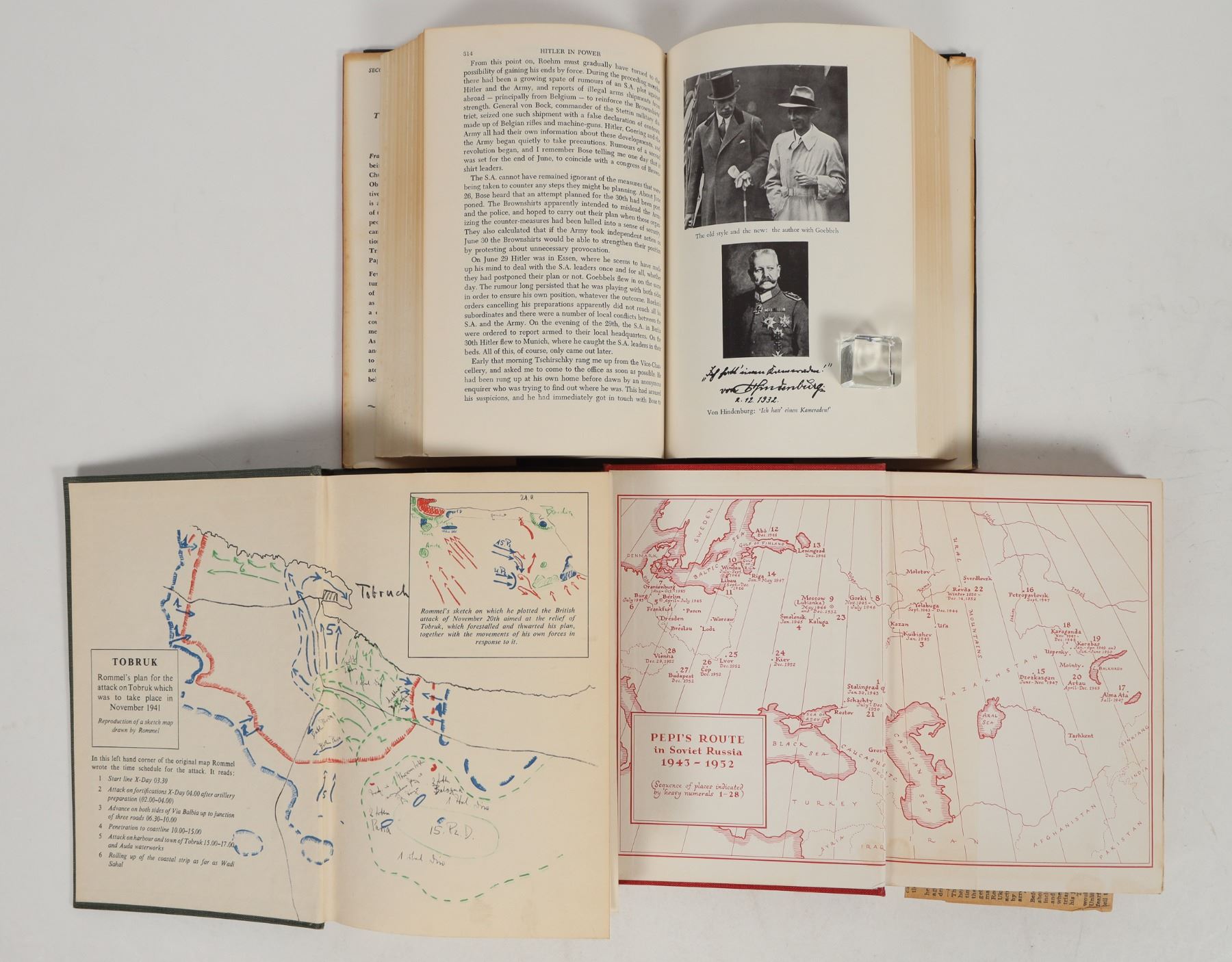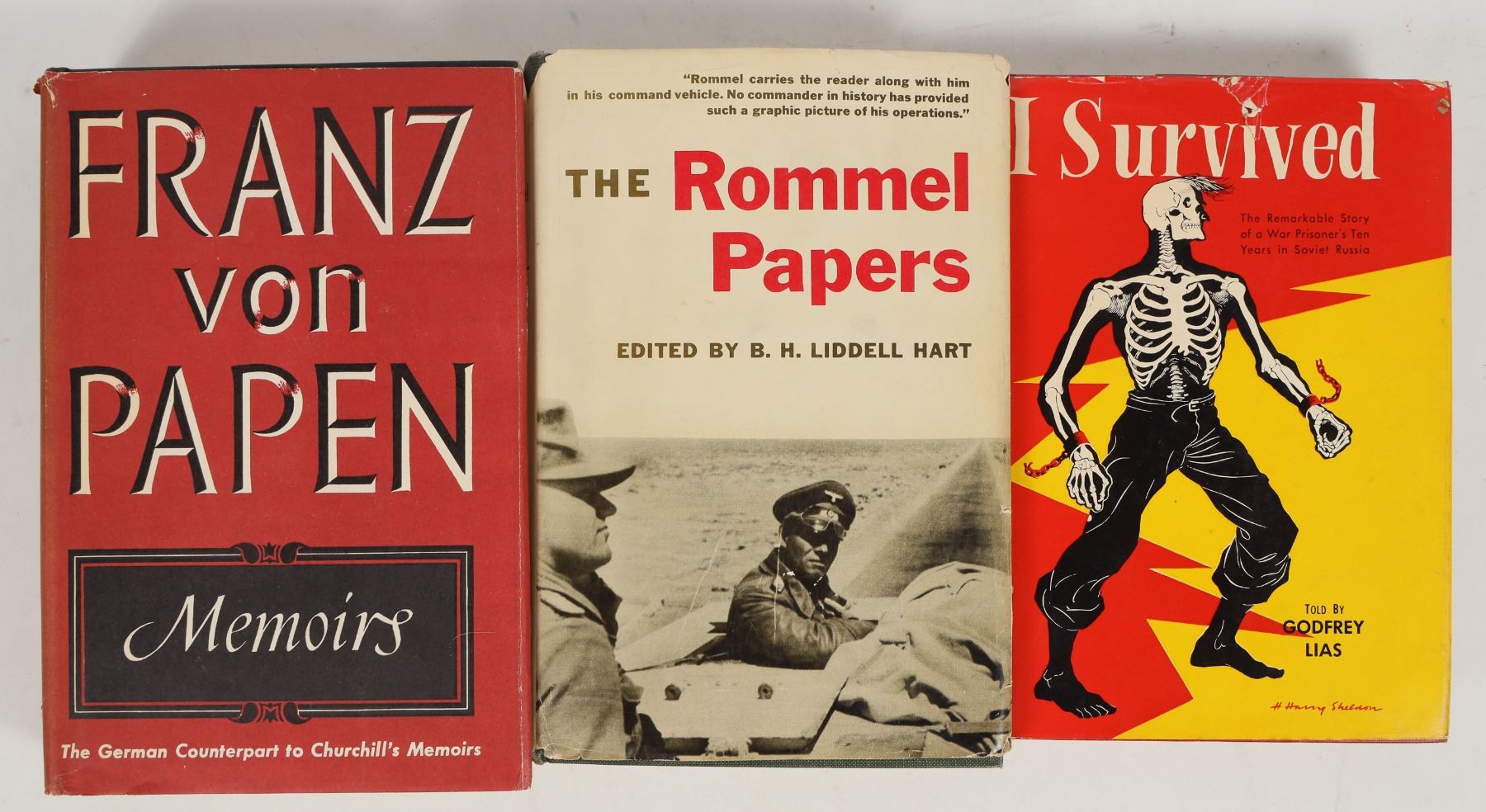 Group of 3 uncommon books on World War II, following the stories of German participants in the war. Included in the lot are "The Rommel Papers" edited by B.H. Liddell Hart (1953); "Franz von Papen Memoirs" translated by Brian Connell (1953); and "I Survived" by Godfrey Lias, the story of a Nazi POW held in Soviet prison (1954). All three hardback w/ original DJs, in good condition.