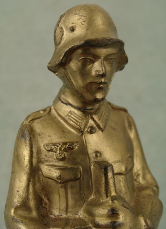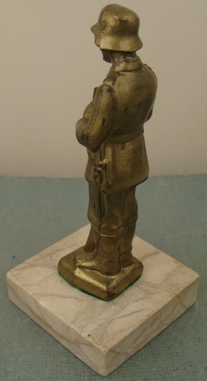 This is a rare WWII era find-- a statue of a Nazi soldier holding a rifle. It is brass tone plated metal, affixed to a white marble base. Its condition is very good, with some surface wear in spots. The soldier figure stands on the base about 6" tall. * This will be an outstanding addition to your collection.