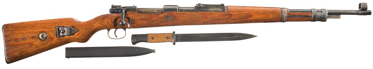 Condition: Fine as partially refinished. The rifle retains 75% original finish with a mix of original finish and some restoration. The rear portion of the barrel retains most of the original finish with some some gray an each side below the rear sight. The receiver retains 90% thinning original finish with some high edge wear. The trigger guard is renumbered and has an artifical smooth brown patina. The stock is very good with a few scattered minor dents and scratches and clear stock markings. The sling is very good. The bayonet and scabbard are excellent. The markings are crisp and clear. Mechanically fine.