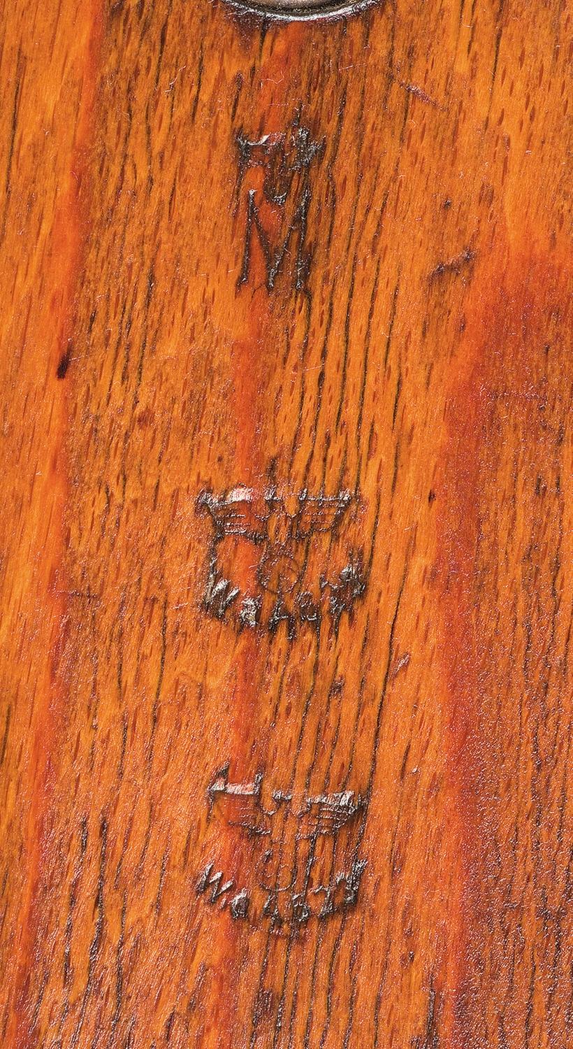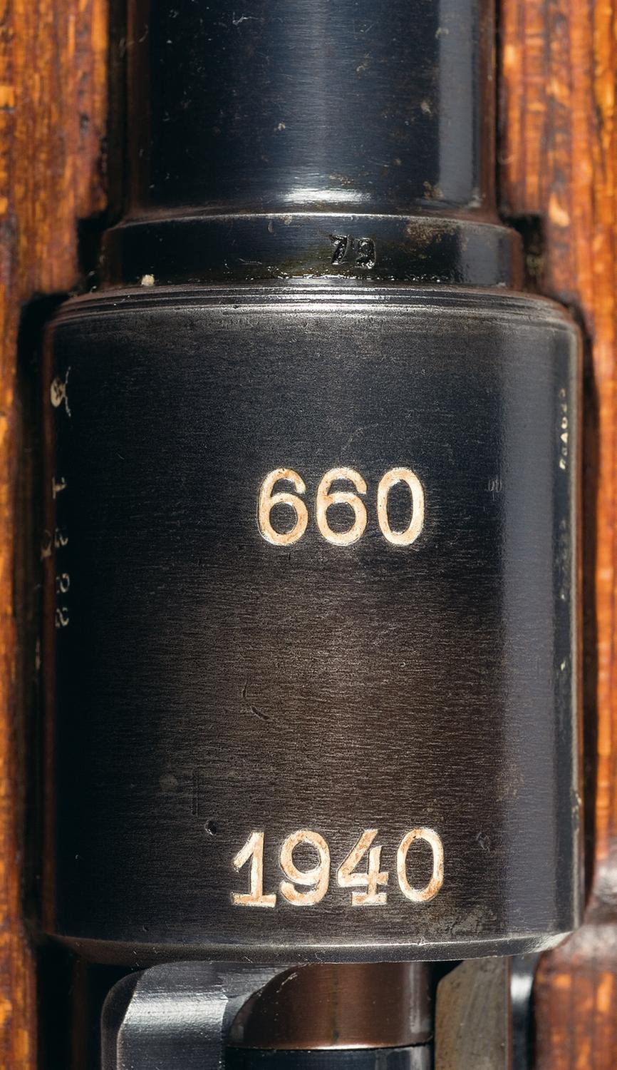 This is an example of a German Navy G29/40 bolt action rifle that was manufactured by the Steyr-Daimler factory and given the wartime code of "660". The top of the receiver is marked "660, over 1940" and the side of the receiver wall is marked "G29/40", the right side of the receiver is marked with three "Eagle WaA623" and one "Eagle 77", the left side has the serial number and Nazi firing proof, the right rear "157" and two "eagle/WaA623" proofs directly behind the hand guard on the right side. The left rear of the barrel is also marked with the Nazi firing proof and serial number. Standard hooded front sight and tangent rear sight graduated to 200 meters. The barrel bands, trigger guard and floor plate are the correct early milled versions and the stock and handguard are the wartime laminated versions with a "eagle/swastika / M" and two "eagle/WaA623" proofs on the right side, two small "eagle / WaA623" proofs on the wrist, an asterisk directly behind the grip and "1222 / a / eagle/WaA18 / C. Eagle/WaA18" on the underside and "N" on the stock disk for the North Fleet. Complete with a leather sling, Alcoso bayonet with wooden handles and metal scabbard. Front barrel band mismatched, otherwise visible numbers match.