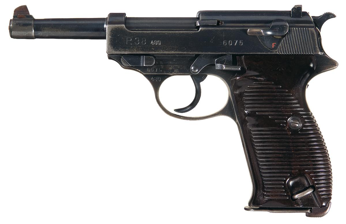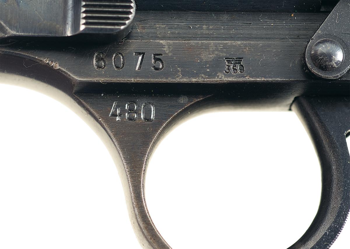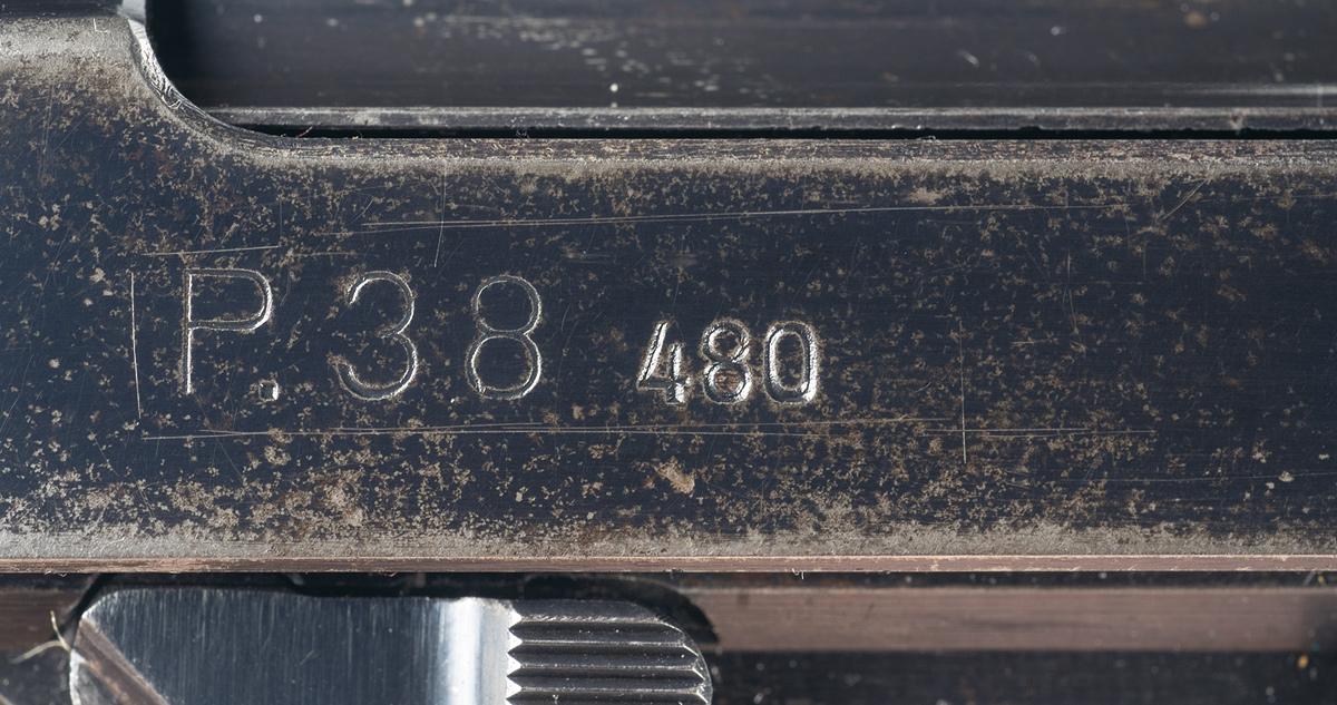 The 480 Code was produced in late 1940 and represented the first true military contract P-38 pistol with approximately 7,250 produced. This earlier production P.38 has the high polish blue finish and brown plastic, ribbed grips. The left side of the slide is marked; "P.38 480", followed by the serial number. The "480" code is also present on the left side of the trigger guard bow. The serial number is marked on the front of the barrel lug and the left side of the frame above the trigger guard bow. The right side of the slide is stamped with two "Eagle/359" Army acceptance marks on either side of a military "Eagle/Swastika" firing proof. "E/359" and "e/ swastika" stamps are located on many of the large and small parts.