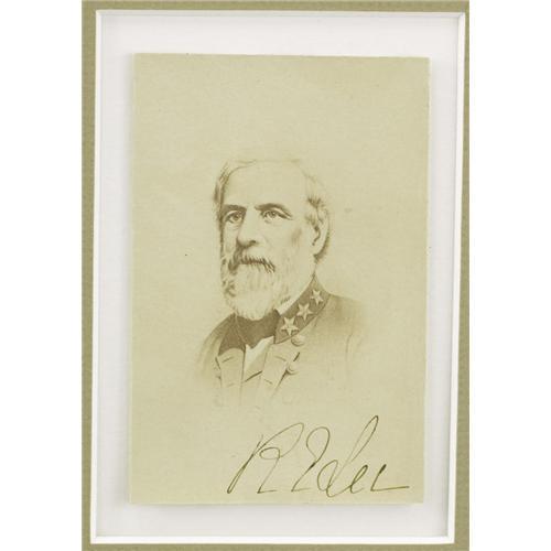 <B>Rare Wartime Signed CDV of Robert E. Lee,</B></I> with “<I>R E Lee</B></I>” in lower field. Matted and framed to 6.75” x 10”. This rare <I>carte de visite</B></I> by Minnis & Cowell of Richmond carries a lithograph made from the firm's 1863 full length photograph of the great general. Lee is depicted here in his prime as a Confederate commander. Nice, large signature on an exceptionally clean print. Very fine condition.<BR><BR><b>Shipping:</b> Framed - with Glass, Small (<a target="_blank" href="http://www.heritageauctions.com/common/shipping.php">view shipping information</a>)