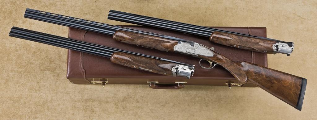 Rare Weatherby Athena O/U “small bore” set in 20, 28, 410 gauge, serial #FA00591 in original Weatherby case, each barrel with its own forend. The gun shows sideplates, single trigger, auto ejectors, select checkered Burl Walnut stock. 20 gauge and 28 gauge measure 28”, 410 gauge barrels are 26”. This very special set is one of a very limited number made for promotional purposes. Excellent to near new, very slight use, 99% plus. Est. $7,000-14,000