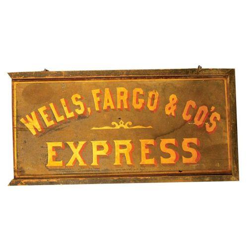 Extremely Rare Wells Fargo and Co. Express Wood Sign. Two sided sand sign, one side in good condition the other in fair condition, missing left side of frame.. 31 X 15 1/4 inches.