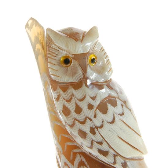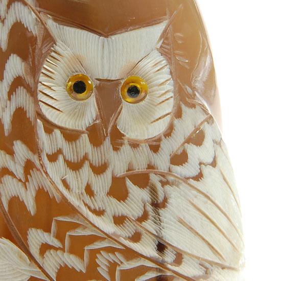 Excellent piece; finely carved Thai WATERBUFFSCRIM in owl image on rare white water buffalo horn; 9"
