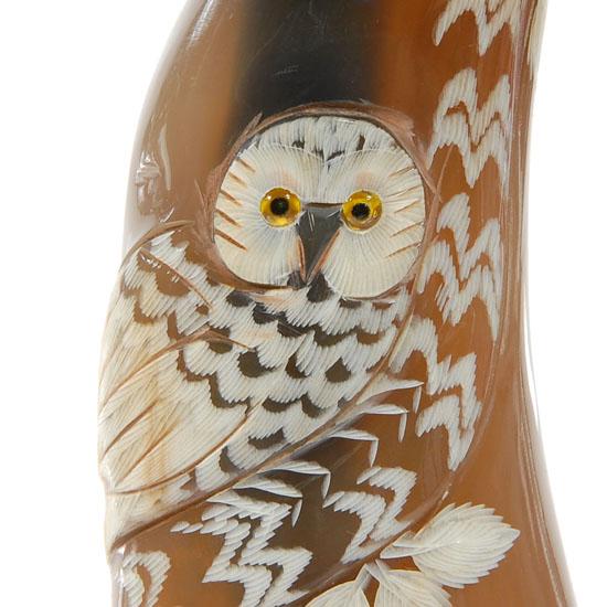 Excellent piece; finely carved Thai WATERBUFFSCRIM in owl image on rare white water buffalo horn; 8"; MULTIPLES AVAILABLE