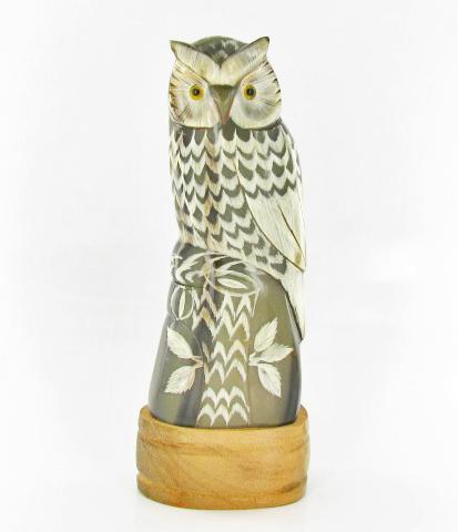 Excellent piece; finely carved Thai WATERBUFFSCRIM in owl image on rare white water buffalo horn; 7.5"