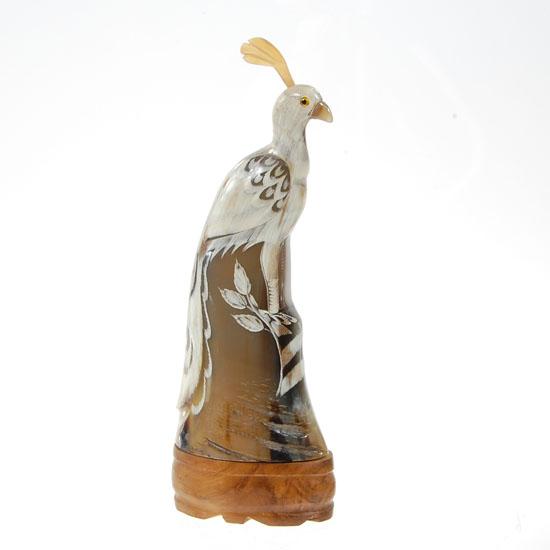 Excellent piece, finely carved Thai scrimshaw in peacock image on rare white water buffalo horn, 10"