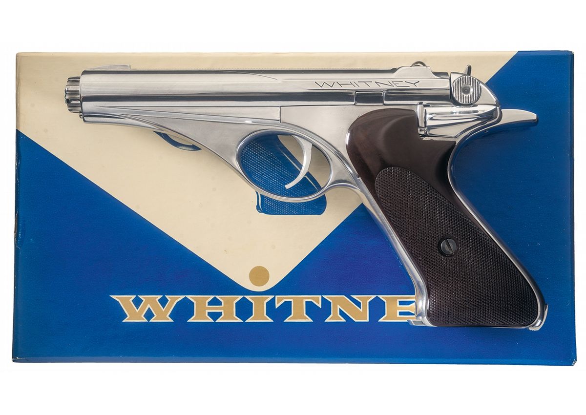 These pistols were manufactured between 1955 and 1962 and had a very futuristic, space age design that utilized a cast aluminum frame in-lieu of the standard steel frames of the day. It was a straight blow-back design, that used a round bolt inside the upper part of the frame, with exposed cocking knobs on the rear of the frame with an exposed hammer. It was fitted with a fixed front and rear sight. The left side of the frame is marked "WHITNEY" and the right side is marked with the address markings. With the original white and blue picture box numbered to the gun, yellow plastic insert, instruction pamphlet and the original warranty card.
