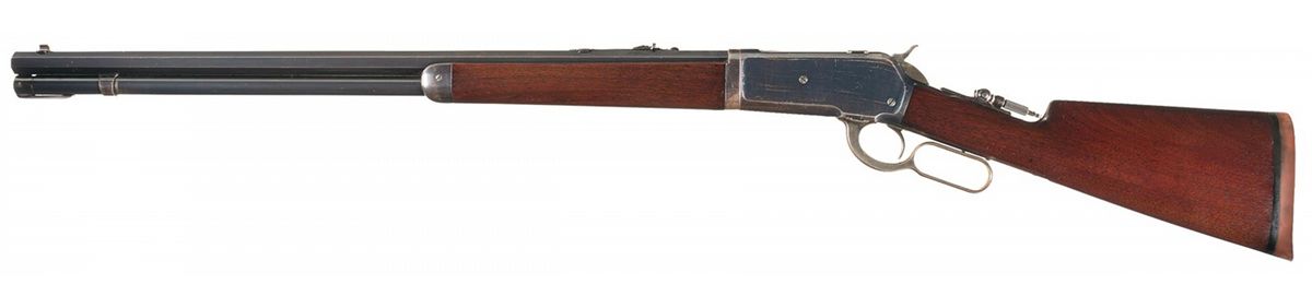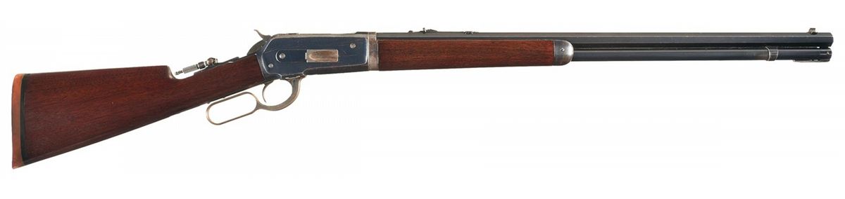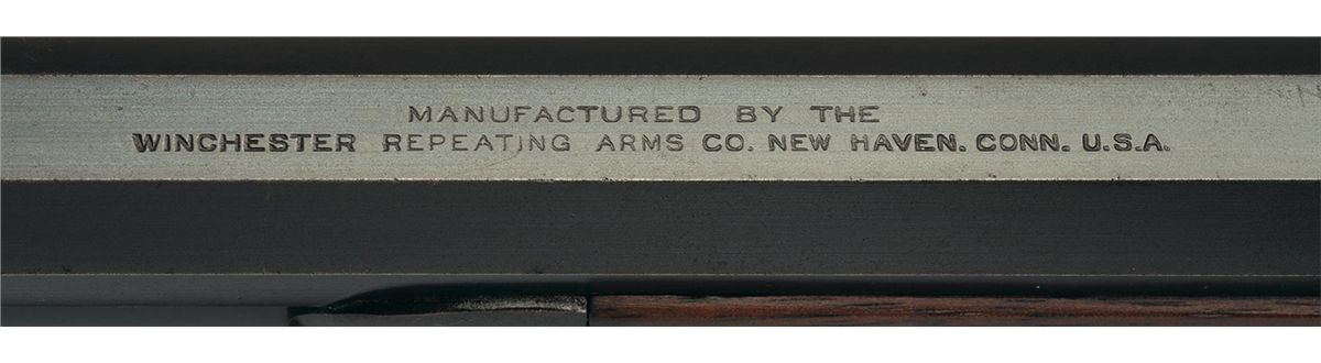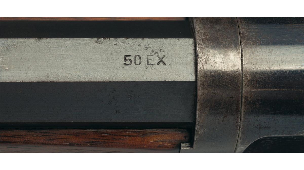 This is an excellent example of a desirable 50 Express Caliber Winchester Model 1886 Takedown Rifle that was manufactured in 1901. The barrel is fitted with a dovetail mounted, Lyman, "Winchester Express" front sight with ivory bead and a sporting style rear sight. A folding peep sight is mounted on the receiver tang. The original shotgun buttplate has been replaced with a later production rubber Winchester marked recoil pad. The top barrel flat is marked "MANUFACTURED BY THE/WINCHESTER REPEATING ARMS CO. NEW HAVEN. CONN. U.S.A." ahead of the rear sight. The caliber ".50 EX" is stamped at the breech. The lower receiver tang is stamped "-PAT.OCT.14.1884./JAN. 20. 1885-" directly behind the trigger and the serial number, "127011" is stamped at the rear. Full length magazine, blue finish with casehardened hammer and lever, and mounted with a smooth walnut forearm and straight grip stock. The Winchester .50 Caliber Express cartridge was introduced in 1899 for the Model 1886 Rifle. High velocity smokeless powder versions of the .50 Express cartridge were comparable to some British elephant cartridges.