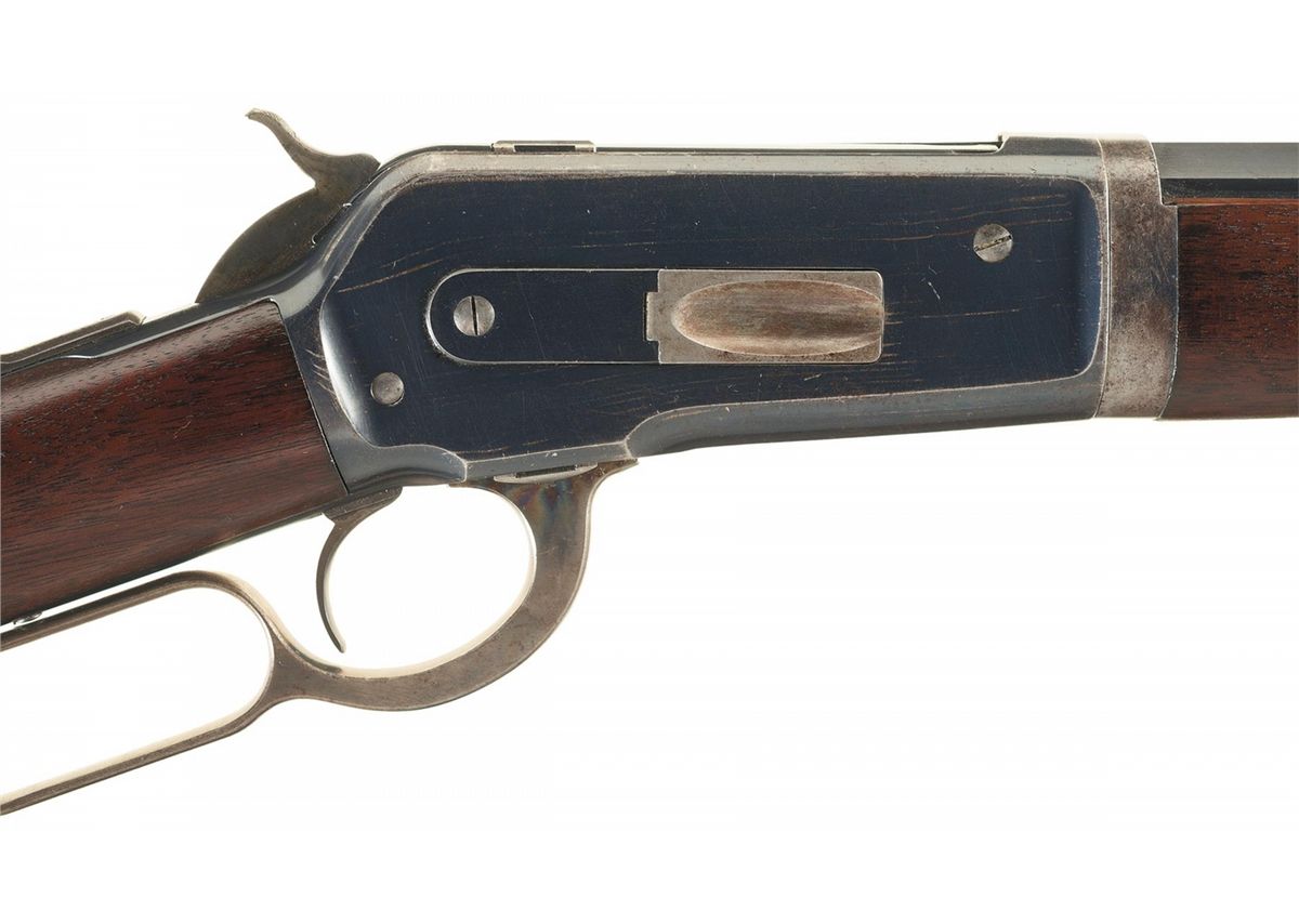 Excellent. The rifle retains 95% of the original blue and casehardened finish with some minor take down marks on the magazine tube, thinning and some bright edge wear. The receiver takedown ring extension has a 50-50 mix of original blue finish and blue-gray patina. The receiver has several minor scratches. The hammer and loading lever have nearly all of the original casehardened finish with strong case colors. The loading gate has a silver-gray patina. The reoiled stock and forearm are very fine with some scattered and very minor handling marks. The later production Winchester recoil pad and spacer fit nicely to the stock. This is an excellent example of a scarce Winchester Model 1886 Takedown Rifle chambered for the .50 W.C.F. Express cartridge.