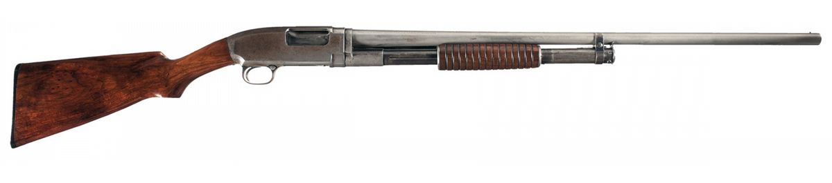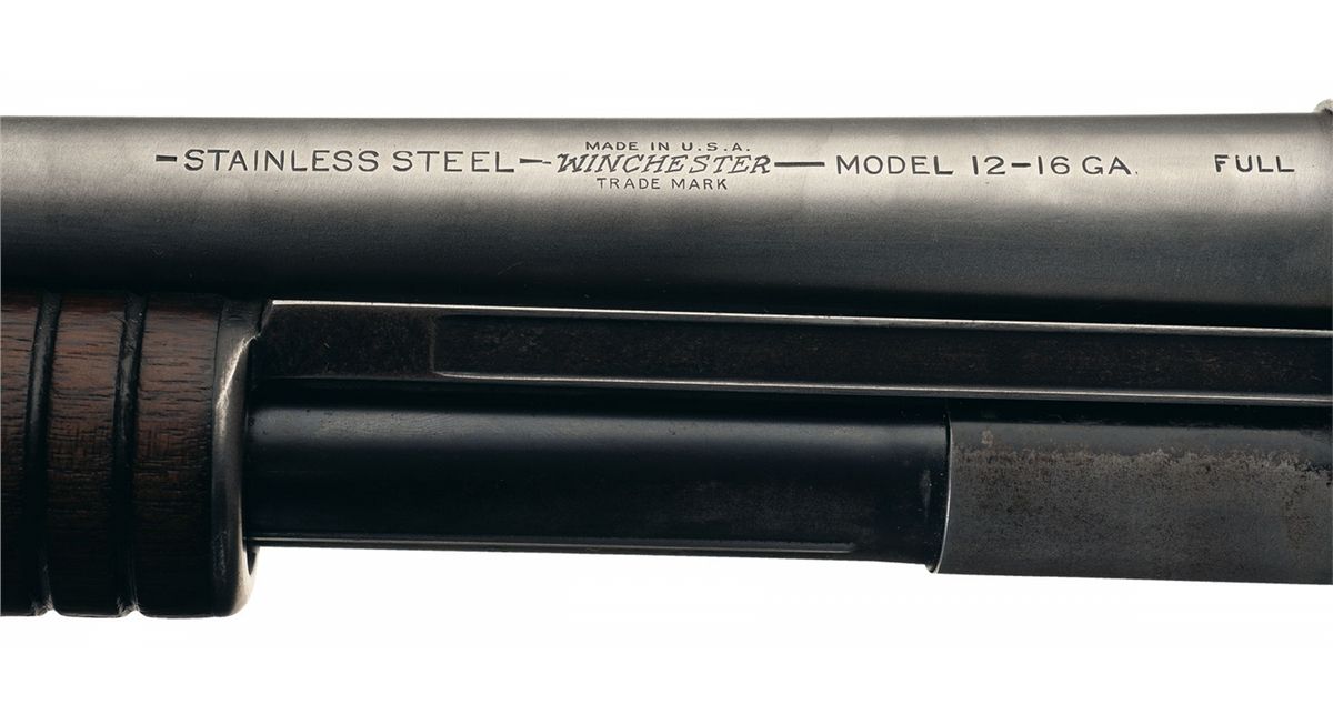 This shotgun was manufactured in 1930 in 16 gauge with the rare stainless steel barrel. There is a single steel bead sight, choke is marked "FULL" and a 2 1/2 inch chamber. The barrel is marked "-STAINLESS STEEL- [three line Winchester trademark] - MODEL 12-16 GA. FULL" on the left side and the two line address/patent dates marking on the right side. Single factory proofmark on the barrel and receiver. 14 groove round walnut forearm and pistol grip stock with a replacement Winchester plastic buttplate. Length of pull is 13 3/4 inches. These stainless steel barrels were originally Japanned and were available for a comparatively short time, all Winchesters with these barrels are very rare and valuable collector's items.