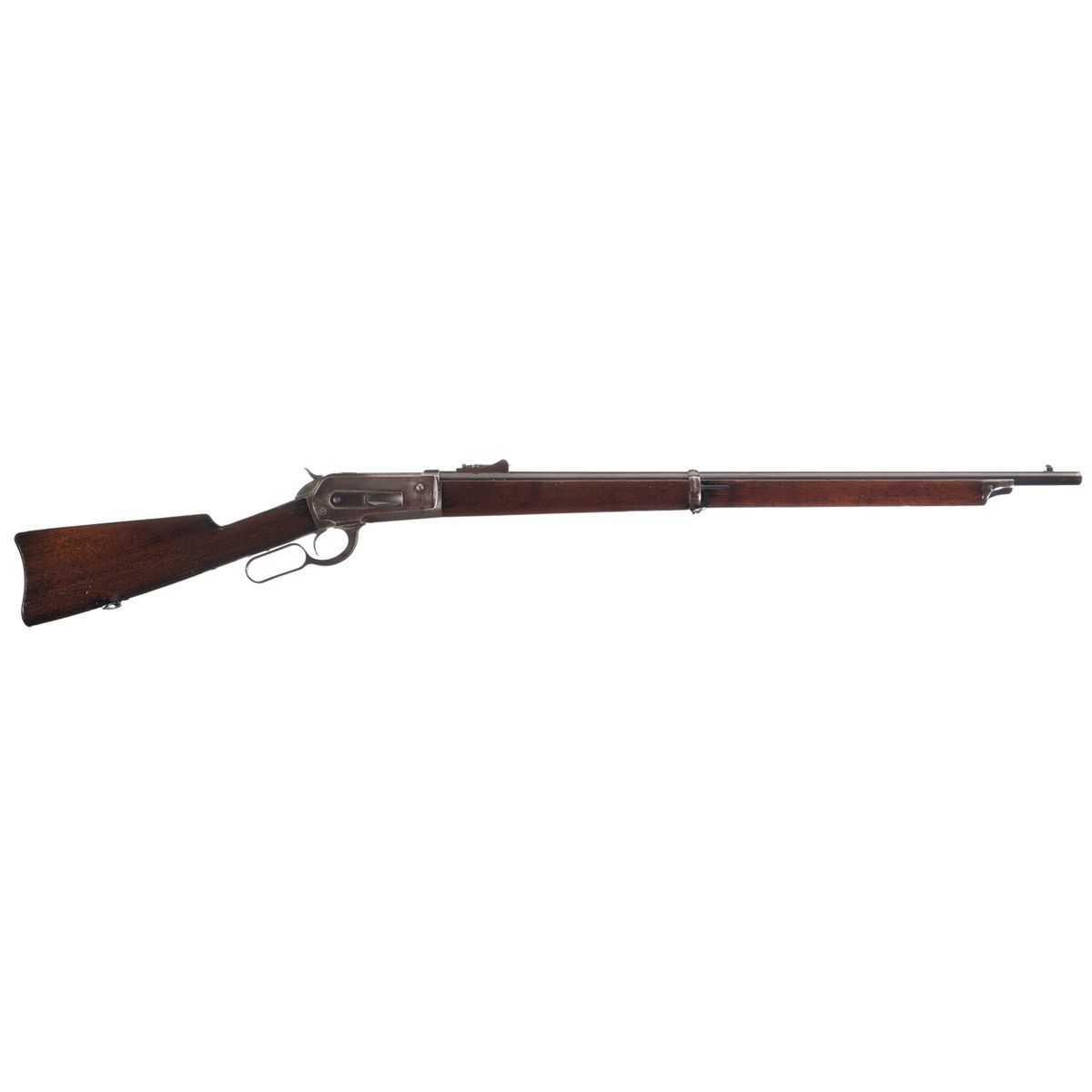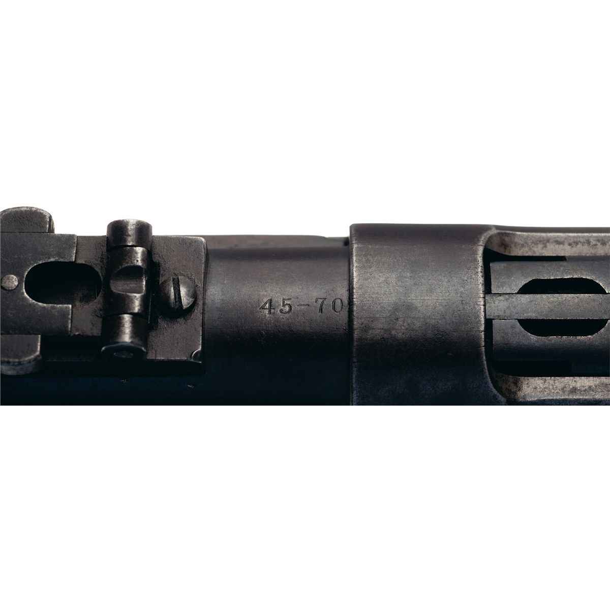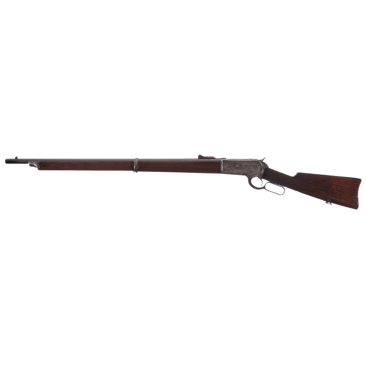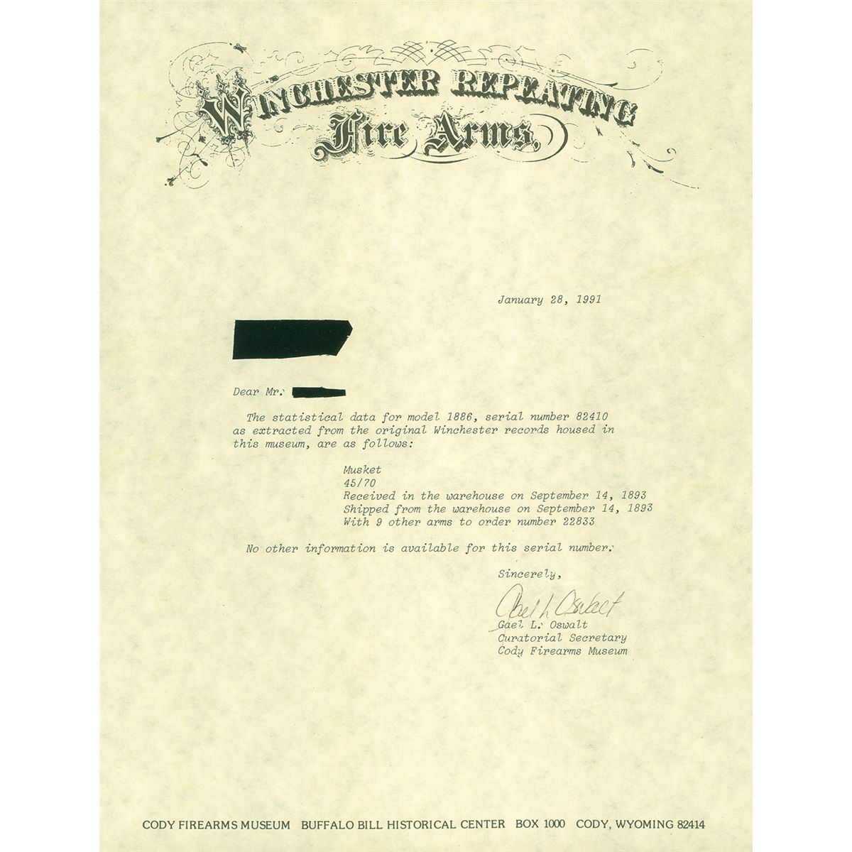 Manufactured in 1893. The top of the barrel is marked "-MANUFACTURED BY THE/WINCHESTER REPEATING ARMS CO. NEW HAVEN, CONN. U,S.A.-" ahead of the rear sight and "45-70" at the breech. The lower tang is marked "PAT. OCT. 14, 1884/JAN. 20, 1885" directly behind the trigger and the serial number at the end, with "-MODEL 1886-" marked on the upper tang. Blade front sight, adjustable rear "ski slope" sight graduated to 1,200 yards. Mounted with a smooth full walnut forearm with single barrel band equipped with a sling swivel and steel forend cap, and straight grip stock with sling swivel and carbine buttplate with compartment containing an original cleaning rod. The accompanying factory letter verifies the musket configuration, caliber and that it was received and shipped from the warehouse on September 14, 1893, with 9 other arms on order number 22833.