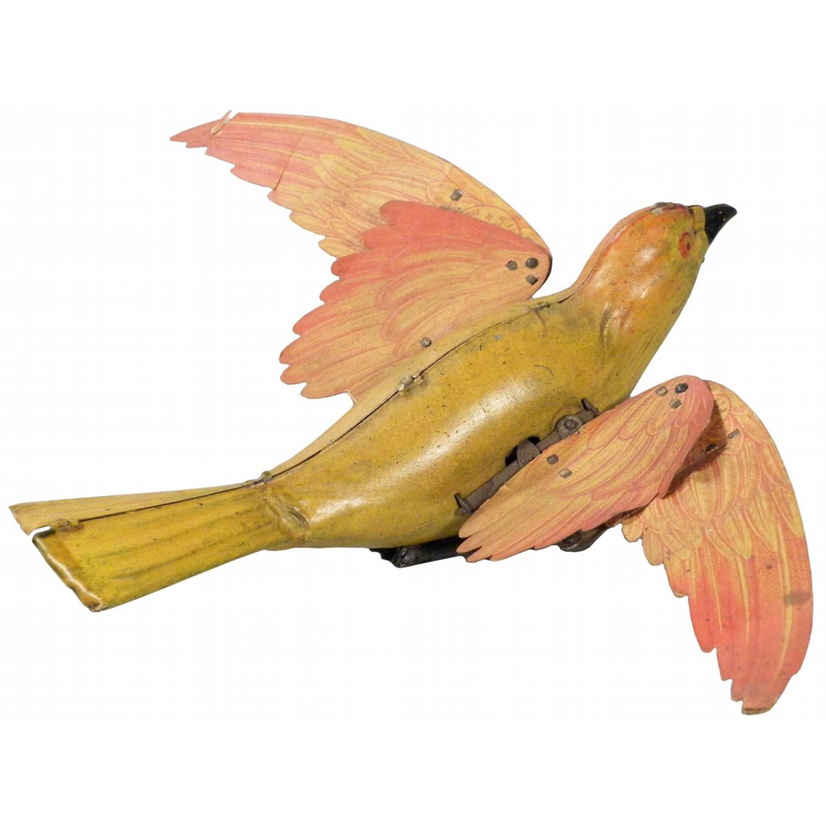 Rare Wind-Up Bird with Paper Wings. Some repair to the wings but all original and in good condition. 7 1/4 inch long.