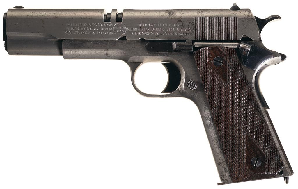 This is a very rare and certainly very unique Remington-UMC factory cutaway pistol. An example of an original Remington-UMC pistol should be considered fairly rare as only 21,676 total were actually manufactured. However in this configuration, as a cutaway it is probably one of only a handful ever manufactured for training or demonstrator purposes. These rare pistols were manufactured in late 1918/19 by the Remington Arms-U.M.C. Co., in Bridgeport, Connecticut using their own drawings that did not conform to the TDP as used by Colt or the U.S. Government, consequently most of these pistols were disposed of after WWI. This rare example has been cutaway in three areas on the right side of the pistol. The center section of the slide and frame which shows the mating/interface surfaces of the barrel lug, barrel link and the importance of the slide stop/release lever/cross pin. The second area is over the rear end of the barrel which shows the interface of the locking lugs of the barrel and slide. The third area is on the rear of the frame/slide which clearly shows the critical interface of several parts, that includes the sear and disconnector with the hammer and the interface of the sear spring and grip safety with all of those parts. The slide retains the three line, two block factory markings of "PATENTED DEC.19.1905/FEB.14.1911.AUG.19.1913./COLT'S PT.F.A.MFG.CO." followed by "MANUFACTURED BY/REMINGTON ARMS UMC CO. INC./BRIDGEPORT. CONN.U.S.A.", with the with the circled "REMINGTON/UMC" logo between the two blocks. The right side has the partial markings of "MODEL OF 1911/U.S. ARMY CALIBER .45". The frame is correctly not marked with "UNITED STATES PROPERTY", nor does it have any U.S. Government final inspector's initials, clearly indicating this was done as a factory cutaway and not and Ordnance cutaway. The frame is also not serial numbered and the entire pistol is still in the white factory finish except for some of the small parts being blue, which gives a nice contrasting finish. The top of the chamber area is stamped with a single "P" proofmark. The rear of the slide above the firing pin stop is stamped with a single letter "E" provisional inspection mark. The scarce pistol is complete with an original two-tone blue magazine with the diamond pattern checkered walnut grips.