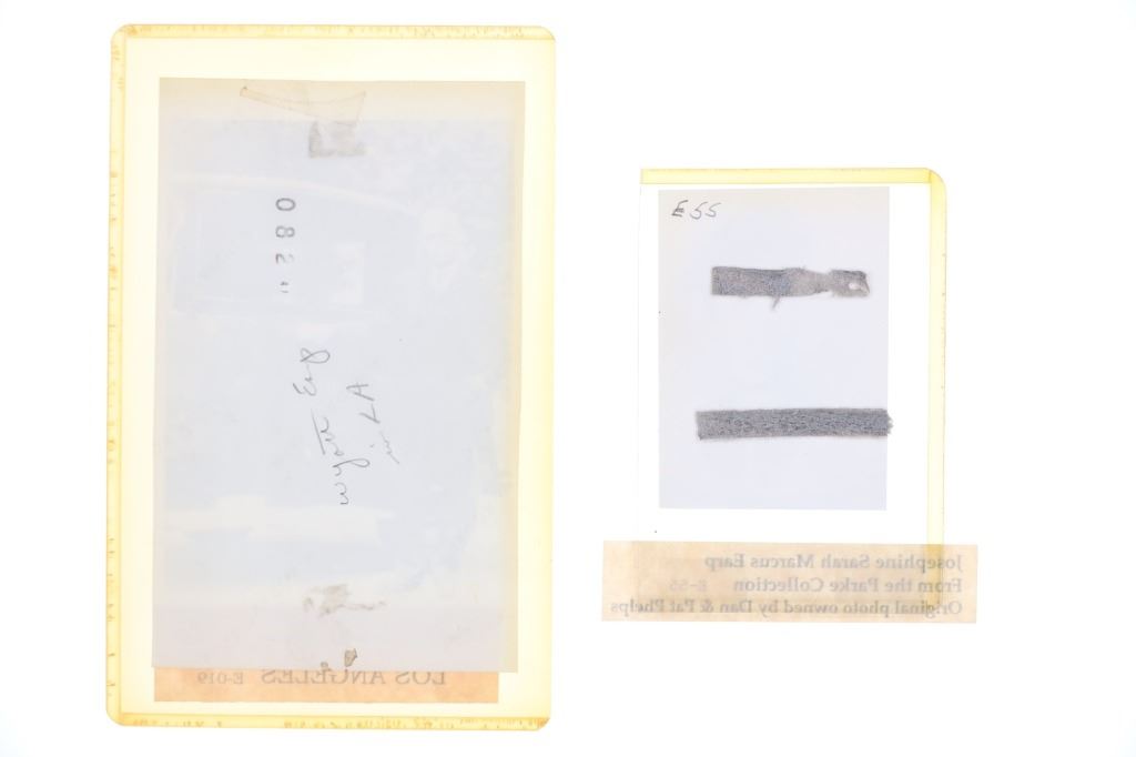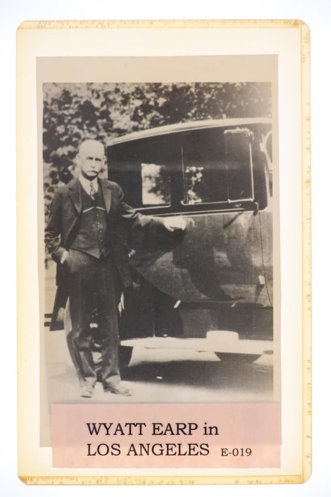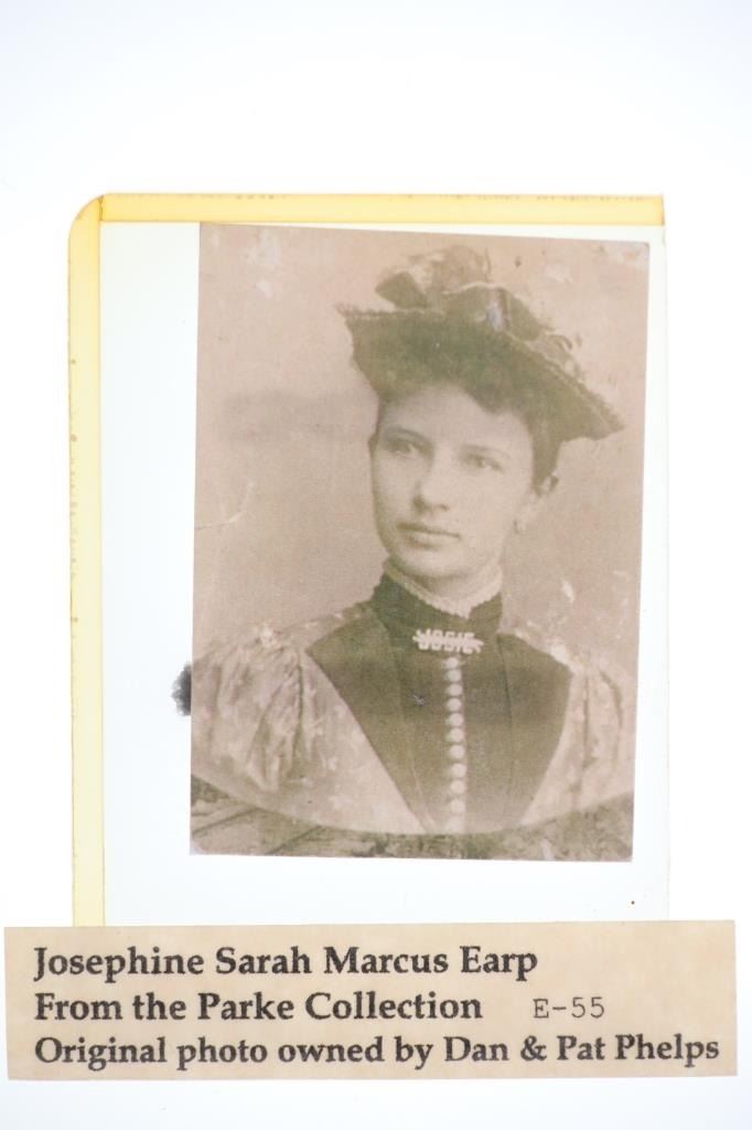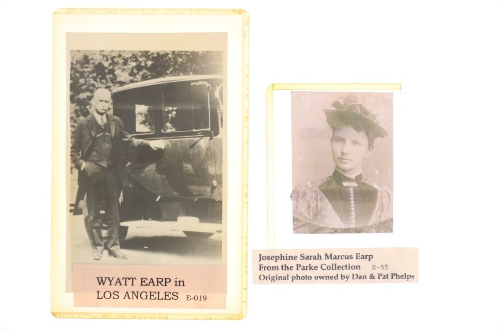 For your consideration are Rare Wyatt and Josephine Earp Photographs. Provenance: Tombstone Western Heritage Museum, Tombstone. Wyatt is seen in Los Angeles standing alongside a 1926 Packard Opera Coupe that is believed to have owned by his friend, silent film actor William S. Hart. The studio photo shows a young teenage Josephine before she left San Francisco for Arizona and Tombstone. Wyatt Earp was a legendary America Old West gunslinger, gambler, and lawman in Dodge City, Kansas, Deadwood in Dakota Territory and Tombstone in Arizona Territory. Earp was involved in the gunfight at the O. K. Corral, during which lawmen, which included his brothers Morgan and Virgil as well as Doc Holliday, killed three outlaw Cochise County Cowboys on October 26, 1881. After leaving Tombstone, Wyatt went to San Francisco to spend time with his convalescing brother Virgil, his wounds received during the Gunfight at the O. K. Corral in Tombstone. Wyatt and Josephine met each other in Tombstone in 1881 a short time before the infamous gunfight, Josephine at the time having been recently involved in a relationship with Sheriff Johnny Behan. Some historians have suggested that Behan and Earp knew of their mutual attraction to the same woman before the Gunfight at the O.K. Corral, which may have contributed to their animosity. From 1883 until Wyatt's death in 1929, Wyatt and Josephine stayed together in a commom law marriage. Tombstone Western Heritage Museum labels on the face of the clear protective plastic sleeves read, "WYATT EARP in LOS ANGELES", museum code, "E-019", and, "Josephine Sarah Marcus Earp From the Parke Collection Original photo owned by Dan & Pat Phelps", museum code, "E-55". The protective sleeves measure respectively 4"W x 6"L and 2.625"W x 4"L, combined weight is U6.
