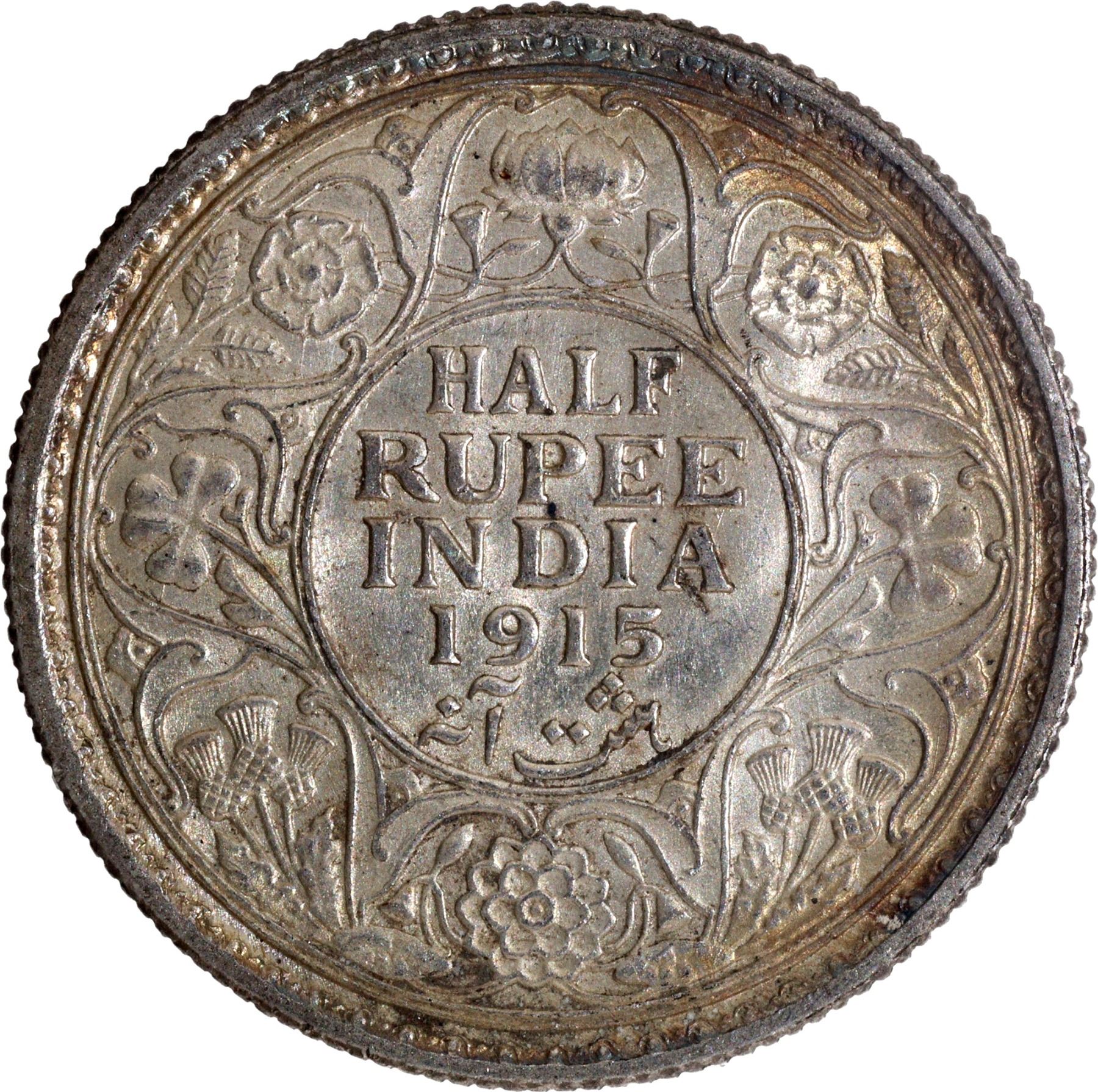 1915, King George V, Silver ½ Rupee, Calcutta Mint, no dot, (PR # 322/GK # 1052), rainbow-like toning, strong features, AU-UNC, Rare Year.