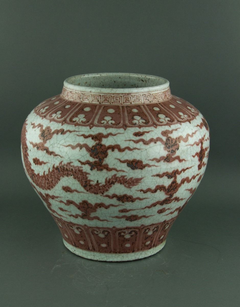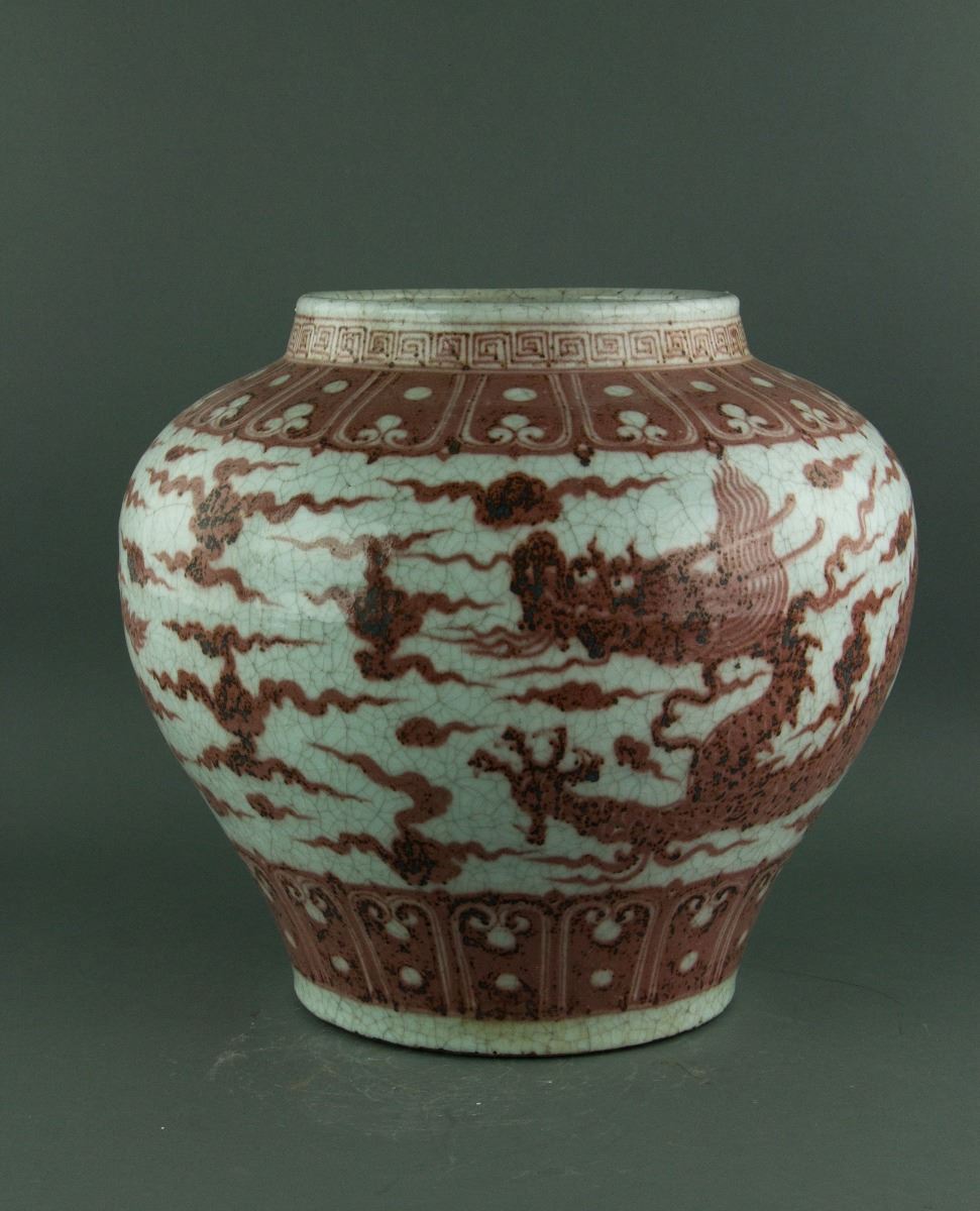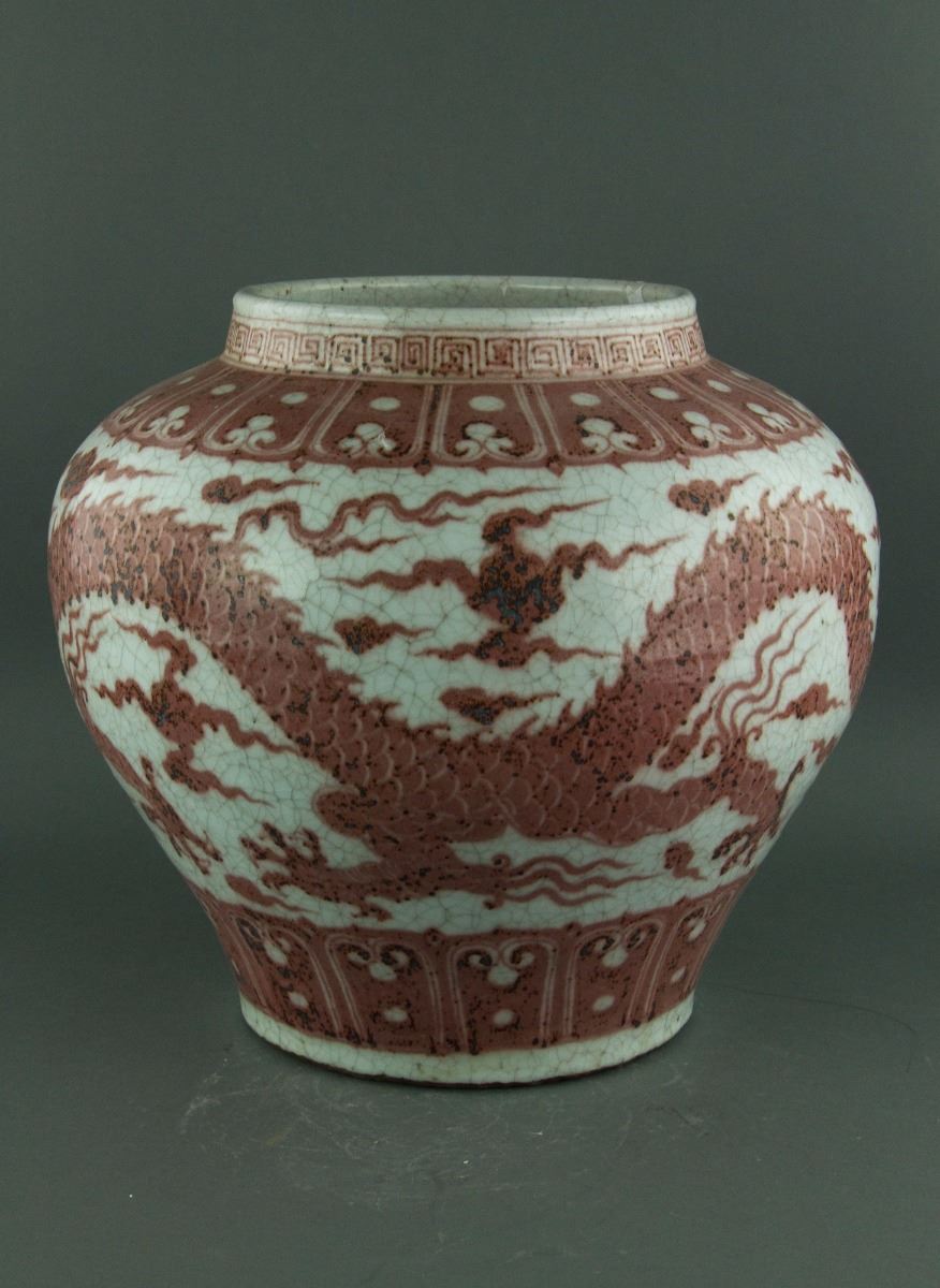 Chinese rare large copper red porcelain jar; Yuan or Ming period; of globular body tapered to the bottom and connecting to a short cylindrical neck; painted with five-clawed dragon amidst clouds; all between two bands of pedal-lappets; unglazed base; H: 37 cm, D: 39 cm, 8.5 kilograms