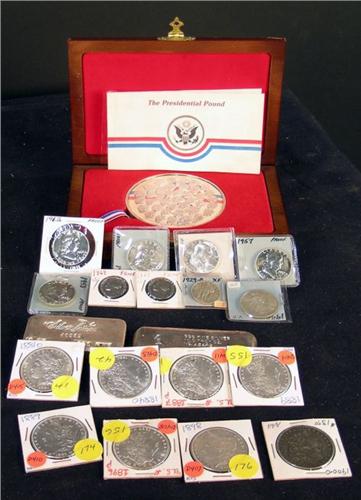 Rare and Collectible Coins: 5 Ben Franklin Half Dollars (1957 Proof, 1958 Proof, 1961 Proof, 1962 Proof, 1962 BU; 2 Walking Liberty Half Dollars; 1940 VF; 1942 S AU; 9 Liberty Head Silver Dollars- 1881, 1884, 1885 P, 1887 P, 1889 X2, 1896, 1898, 1900 AAA: