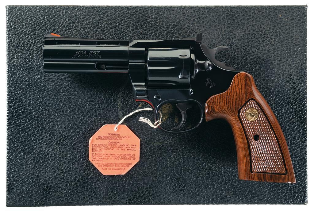 There were only 1,200 Boa's manufactured in 1985 with half having a 4 inch barrel and the other half a 6 inch barrel. All Boa's were purchased from the factory by Lew Horton Distributing Co. and were then sold to the public. This example has a 4 inch barrel with a fixed ramp front sight with orange insert and a fully adjustable rear sight. Fitted with a set of checkered hardwood grips with gold Colt medallions. With a black leatherette Colt hardcase lined in red velvet.