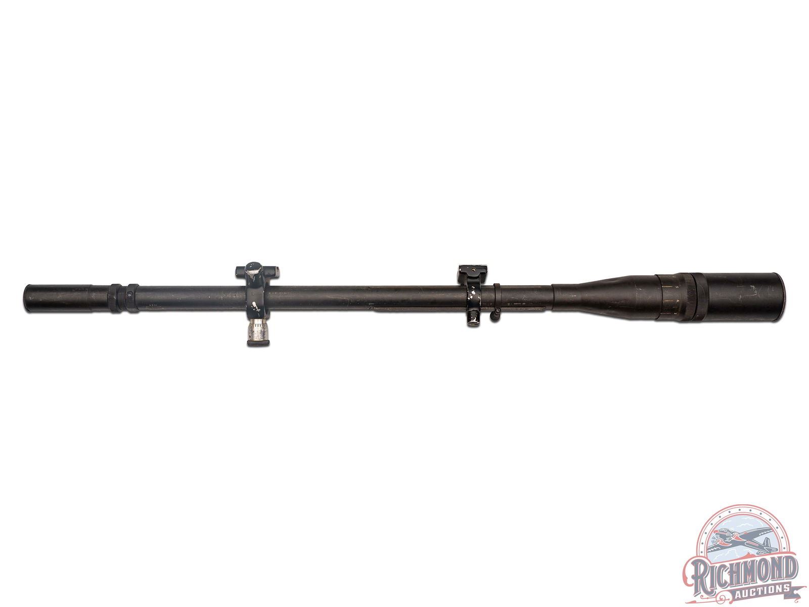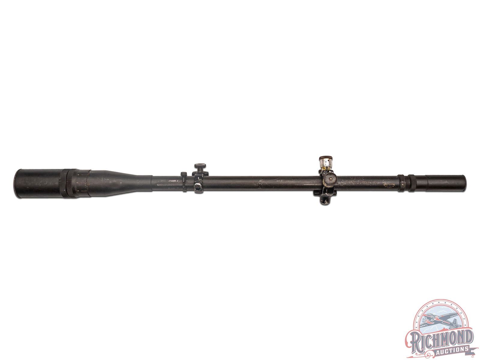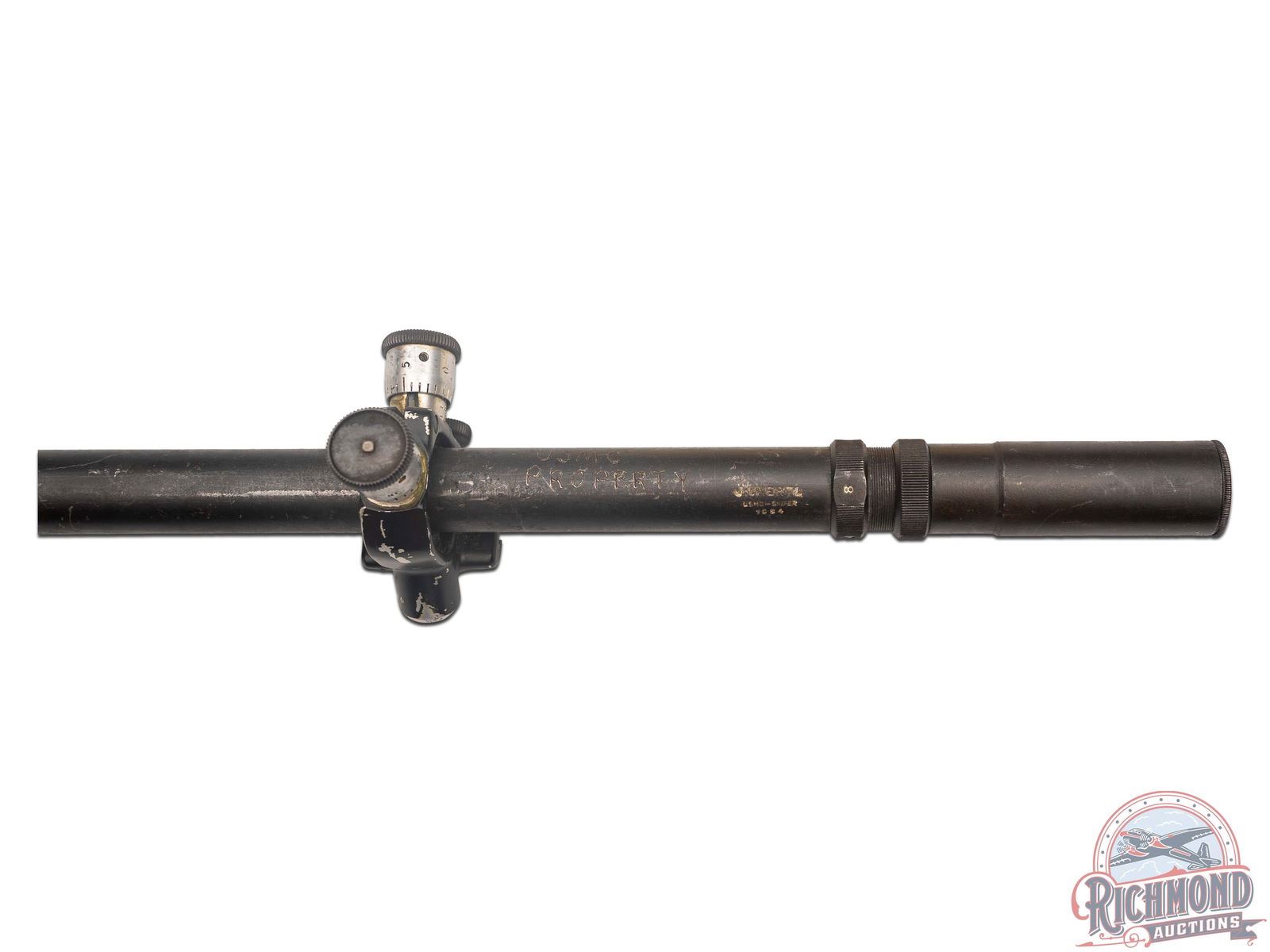 Made by John Unertl in Mars, Pennsylvania in 1942, with the government ordering approximately 3500 with 1750 actually being delivered. Scope measures 23-1/2" long with 1-1/2" front bell with adjustment grip. 3/4" tube with 8x crosshair reticle. Scope has original steel screw on caps, black Japaned finish, and Posa type micrometer mount marked "J. Unertl/USMC-SNIPER/1084". Scope is also marked with electric pen "USMC Property" with original Parkerized finish.