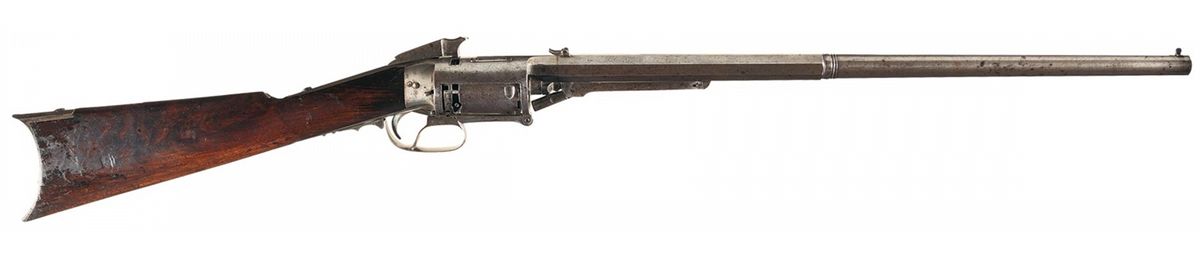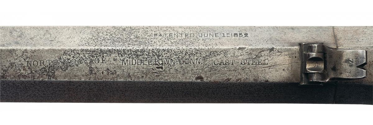 Six shot revolving rifle manufactured by H.S. North and Edward Savage of Middletown, Connecticut, c. 1856-1859. Total production is estimated at about 600 rifles. The rifle has a distinctive combination trigger guard/cocking lever, external self-cocking hammer and partial shield that covers the top and front of the cylinder. The barrel has a folding two-position rear sight and a dovetail mounted iron rear sight. A flat sided loading lever is mounted beneath the barrel. The oil finished straight grain black walnut stock has a crescent steel buttplate and a round brass patch box on the left side. The top barrel flat is stamped "NORTH & SAVAGE MIDDLETOWN CONN. CAST STEEL" in one line. "PATENTED JUNE 1" 1852" is roll-stamped on the right barrel flat and "THE WORLD'S REVOLVER" is stamped on the left flat.