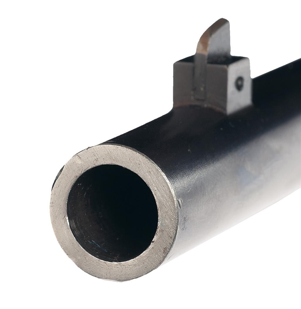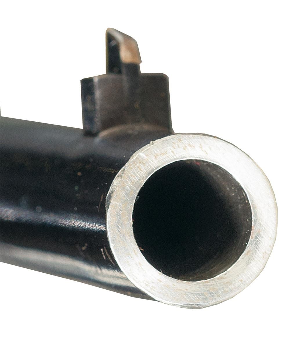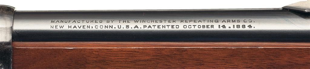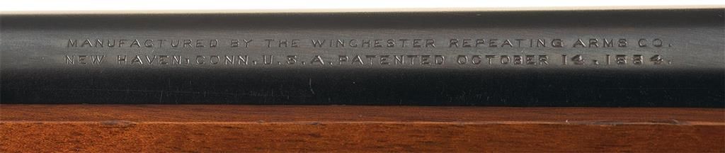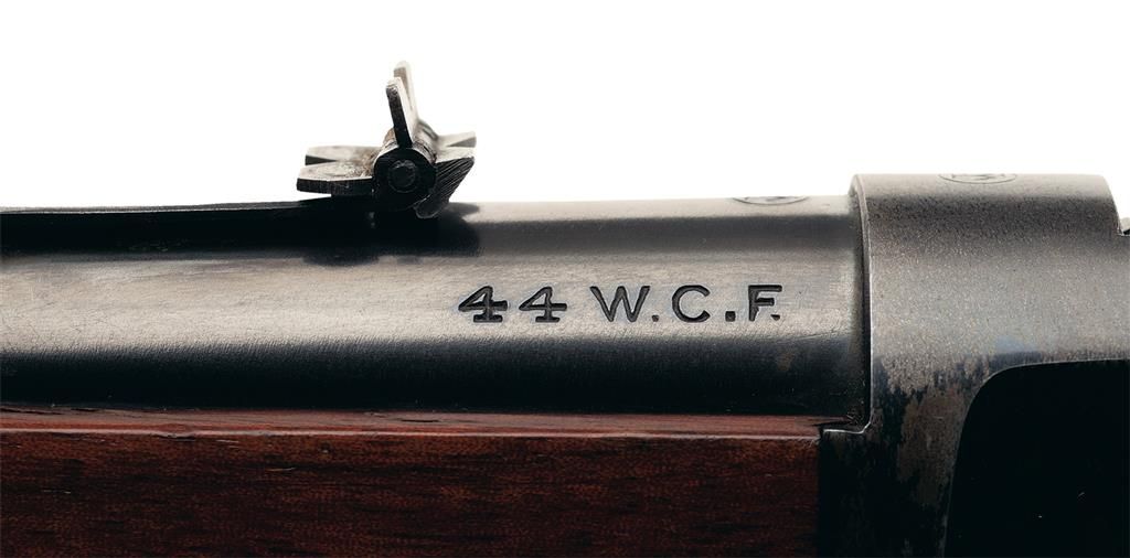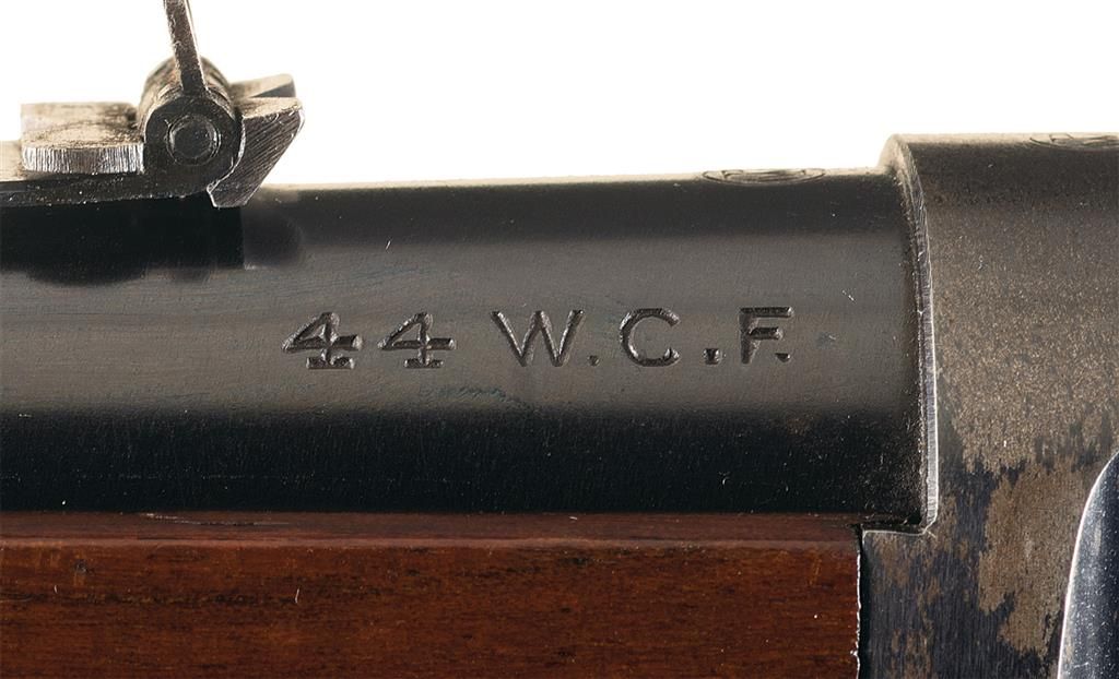 This is a truly unique Winchester Model 1892 Saddle Ring Carbine with three special order features that was manufactured in 1915. The unique special order features on this carbine are the smooth bore 44 W.C.F. chambering. The actual bore diameter measures .420, so that indicates the barrel was never rifled by the factory validating the authenticity of this barrel, it has a half length or button magazine and it is fitted with a very rare short yardage Winchester Express rear sight. This sight is rarely encountered and is calibrated for 50, 100 and 200 yards, with each sight leaf having a small platinum sighting line. The left side of the receiver is fitted with a factory saddle ring and staple. The top left side of the barrel ahead of the rear sight is marked "MANUFACTURED BY THE WINCHESTER REPEATING ARMS CO./NEW HAVEN, CONN. U.S.A. PATENTED OCTOBER 14. 1884.", with the caliber designation "44 W.C.F." at the breech. The rear of the barrel and top of the receiver are stamped with the oval Winchester "W/P" proofmark. The serial number, "770947" is stamped on the underside of the receiver. The upper receiver tang is marked "MODEL 1892/-WINCHESTER-/TRADE MARK" Blue finish with casehardened hammer and lever, and mounted with a smooth beautiful straight grain forearm and straight grip stock with a checkered hard rubber shotgun style buttplate. No records are available to writer at time of description, but the gun is undoubtedly original!