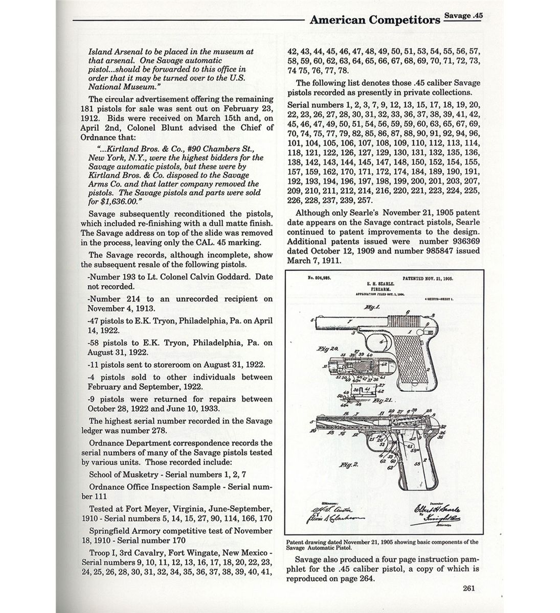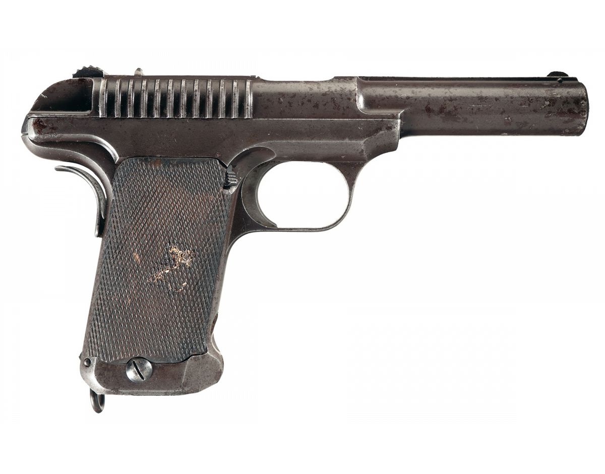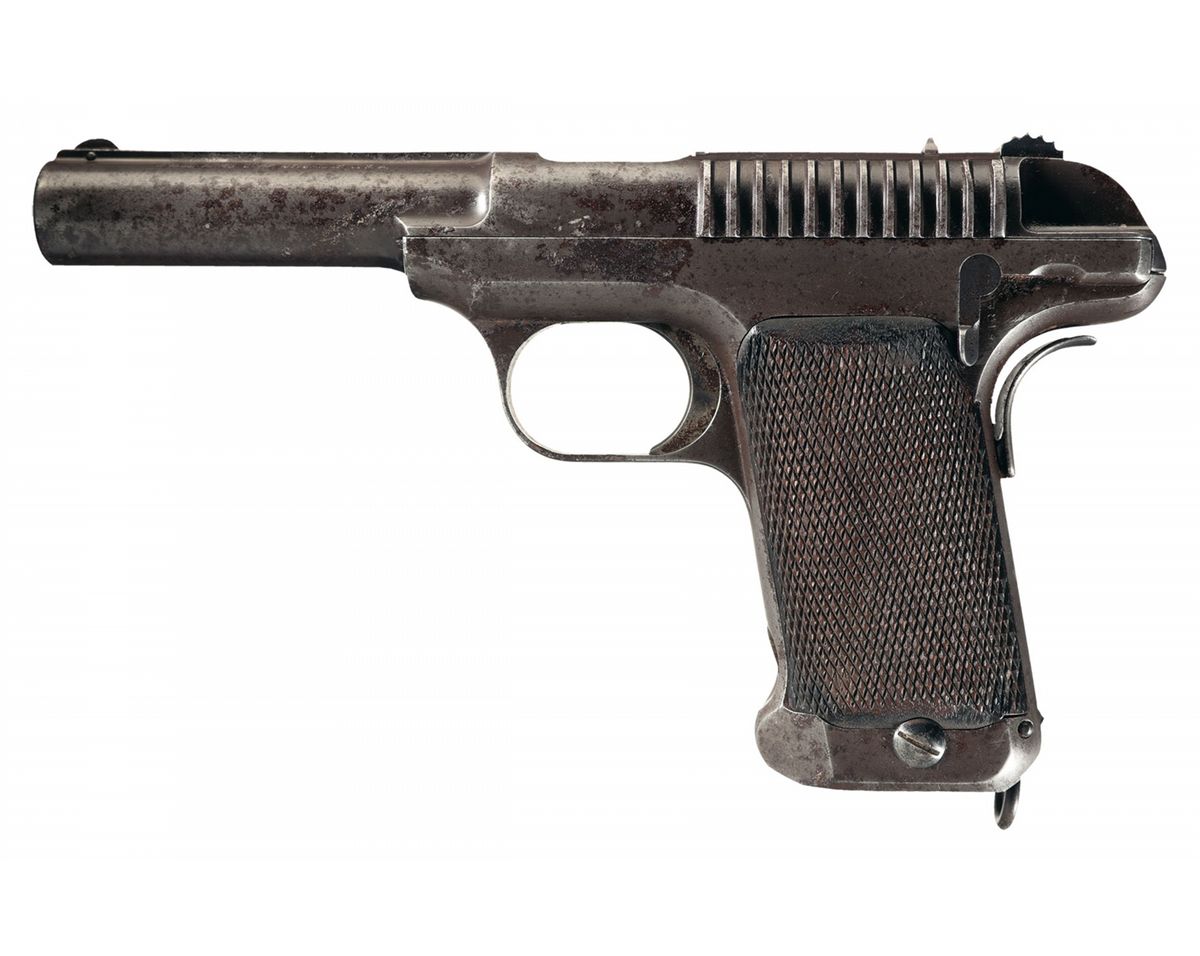 This is a rare and unique US Military "Test" pistol that was originally manufactured for the 1907-1911, U.S. Military Test Trials. During the Philippine Insurrection, the US Army had been equipped with the Colt Model 1894 Revolver that fired the anemic Colt 38 revolver cartridge. Subsequent to that, in early 1904 John Browning was developing a substantially larger and improved cartridge, that he wanted to market to the U.S. Military, which resulted into the 45 ACP cartridge. In January 1906 BG Crozier, (Chief of Ordnance) issued a letter of invitation to the gun manufacturing industry to develop and submit a new semiautomatic handgun based on utilizing this new 45 ACP cartridge. Eighteen companies initially responded but only eight actually submitted a test sample pistol, with Savage and Colt being two of the companies. Ultimately this competition resulted in the contract award to Colt for the Model 1907 pistol. The Savage Model 1907 test pistols were issued to the 3rd, 6th and 11th Cavalry units for field tests, with specific pistol being issued to Troop I 3rd Calvary, Fort Wingate NM., as listed on page 261, of the book "U.S, Military Automatic Pistols 1894-1920", by Scott Meadows. In total only 288 Savage .45 caliber automatic pistols were manufactured between 1907 and 1911. At the completion of the 1911 competition all the pistols were sold to Tryon & Company with most all examples being refinish and remarked. This specific pistol is one of those specific examples, as the original factory markings on top of the barrel rib (except for the CAL 45 markings), has been removed, with the left side of the barrel remarked "SAVAGE ARMS CORP. UTICA N.Y. U.S.A.". However this example still retains the original thin/narrow grip safety that is not integral with the rear of the frame; it has the Model 1909 improved marking designs of "FIRE" and "SAFE" at the rear of the frame and the wider checkered walnut grip panels. It is complete with one original blued magazine that has the nickel plated follower and blued floor plate, numbered "110" on the back side.
