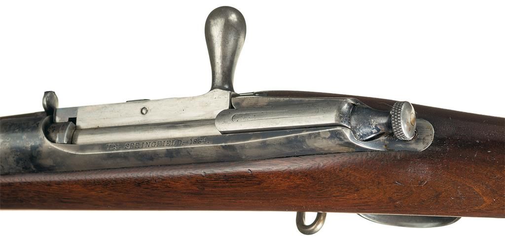 This is a very fine example of one of only 753 bolt action Chaffee-Reese rifles manufactured by Springfield Armory in 1884. This action was invented by General Reuben S. Chaffee and Jasper N. Reese in 1879 and was one of the rifles selected by the Magazine Rifle Board of 1882 for field trials. The innovative magazine consisted of a loading tube through thee center of the buttstock that was loaded through the trapdoor in the buttplate. This tube employed a double ratchet mechanism that moved the cartridges forward each time the bolt was cycled. A cutoff switch on the right side of the receiver allowed for single shots while keeping the magazine fully loaded. Only the initial order of 753 weapons were manufactured, making this one of the rarest rifles manufactured by Springfield Armory. The barrel has the standard Springfield "V/P/eagle head" proof and inspection marks on the left rear of the barrel. The top left side of the receiver is marked "U.S. -- SPRINGFIELD. -- 1884". The left side of the rear sight base is graduated "1-6" (100-600 yards) and marked "C-R", indicating use on either a rifle or carbine. The face of the ladder is graduated "6-14" (600-1400) yards and is drift adjustable for windage and is also marked "C-R" on the lower face. It is fitted with the original full length walnut stock with the original loading tube and feeding mechanism inside. The left rear side of the buttstock has a boxed, "SWP/1884" cartouche with a circled script "P" proof stamped behind the trigger plate. It is complete with the original cleaning rod. Interestingly this rifle is non-factory stamped with "1 (a sideways 8) 74" on the breech end of the barrel.