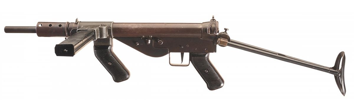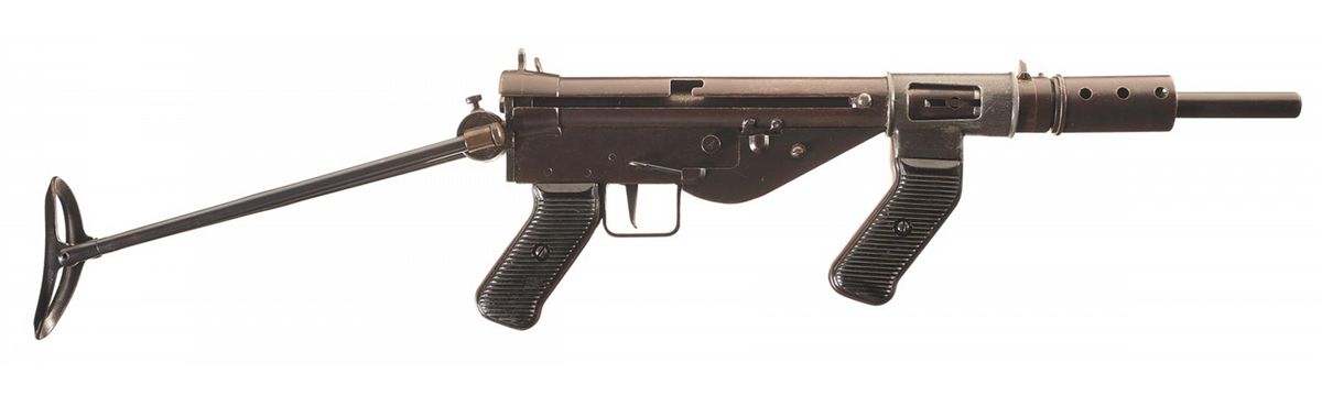 This is a very scarce early WWII AUSTEN submachine gun as manufactured in 1942/43 in Australia. These weapons were developed by the Australian Government due to the shortage in acceptable submachine guns from the British Government and are actually based on two different weapons; the British STEN and German MP40 SMGs, with some manufacturing improvements from the Australians. Their name was derived from two words; "AUstralia" and "STEN", hence the name AUSTEN. With only approximately 20,000 in total made so they had a very small/limited production run and are considered very scarce today. The basic STEN parts are the receiver tube, barrel and locking collar, lower trigger housing/group, with the German designed parts being the folding MP40 style buttstock, the bolt and telescoping firing assembly. The Australian parts/designs are the one-piece cast aluminum magazine well and forward pistol grip assembly (vs. the stamped and welded British version) and the larger/more robust rear collar on the receiver tube. These SMGs use the standard STEN magazine and are considered to be one of the most reliable WWII SMGs. The top of the magazine housing has the cast in markings of an intertwined "WTC/AUSTEN MKI/No. C2999". It still retains its original matching barrel that is marked on the side "C2999/Australian Crown/Crossed Flags" with a very small old import mark on the front section. It is complete with one original magazine.