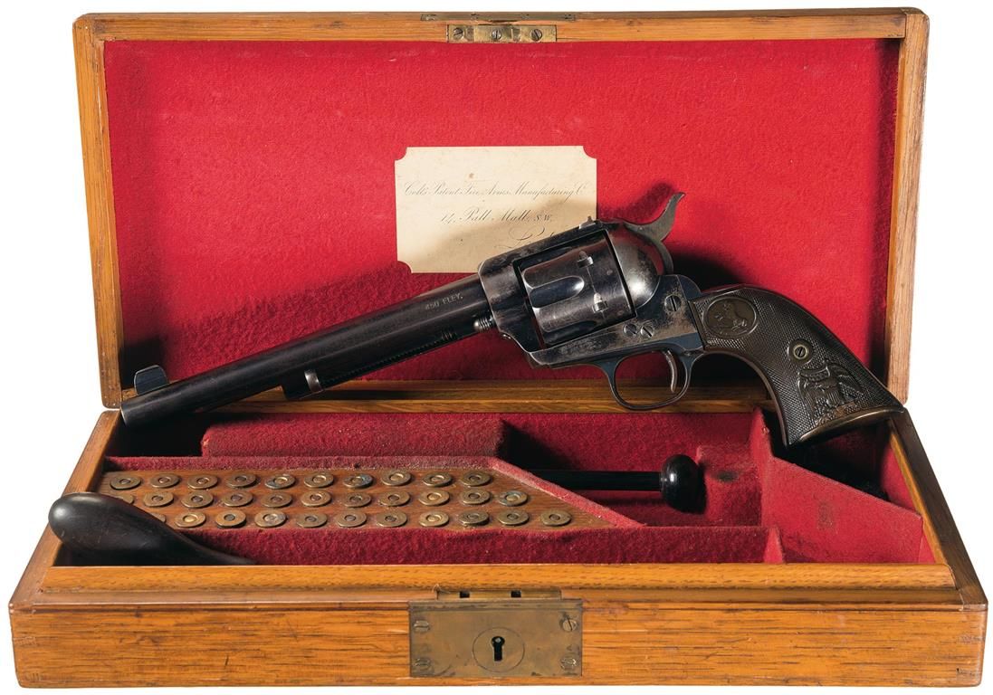 Colt Single Action Flattop Target Revolver with Colt Factory letter. The letter describes the revolver as a "Flattop Target Revolver" with 7 1/2-inch barrel, blue finish, "rubber" grips and notes that it was "Furnished with Military front sights". The letter further notes that this revolver was shipped to Colt's London Agency on September 18, 1890. The revolver has the Colt high polish blue finish on the barrel, cylinder, trigger guard, backstrap loading gate and frame. The hammer has a blued top with polished sides. The revolver features the distinctive flat top strap with dove-tail mounted target rear sight. The barrel has the special order, high profile, fixed, blued "military" front sight. The hammer has bordered, knurling on the spur. The trigger face is knurled. The ejector rod has the late, oval, head. The two piece black, hard rubber, checkered grips are embossed with the Eagle and Shield motif at the heel and the Rampant Colt trademark in an oval at the top. The top of the barrel is roll-stamped with the legend: "COLT"S PT. MFG. Co. HARTFORD CT. U.S.A. DEPOT 14 PALL MALL LONDON" in a single line. The caliber, "450 ELEY." is roll-stamped on the left side of the barrel. The left side of the frame is roll-stamped with the Colt "Three-Date/Three-Line" patent markings. The assembly number "86" is stamped on the inside of the loading gate. A small "G" assembler's mark is stamped on the left front trigger guard bow and a small "S" sub-inspection mark is stamped in the hammer well. Small London "Crown/V" and "Crown/GP" proof and inspection marks are stamped on the underside of the barrel and above each cylinder chamber. The full serial number, "132773" is stamped on the bottom of the frame, trigger guard and backstrap. All of the visible serial numbers match. The revolver is accompanied by a British oak partition case. The case lid is reinforced with brass screws and has an round, brass, plate in the center. The case interior is lined with red baize and has a 33-round cartridge block and three compartments. The case contains: (1) screw-driver with ebony handle, (2) cleaning rod with brass tip and ebony head, (3) blued, L-shaped screw-driver, (4) cleaning attachments and (5) 41 .450 Eley cartridges. A Colt London Agency card is attached to the inside of the case lid. Records show Colt manufactured a total of 84 Single Action Flattop Target Revolvers that were chambered for the .450 Eley cartridge. Revolvers like this example with a factory case are rare.