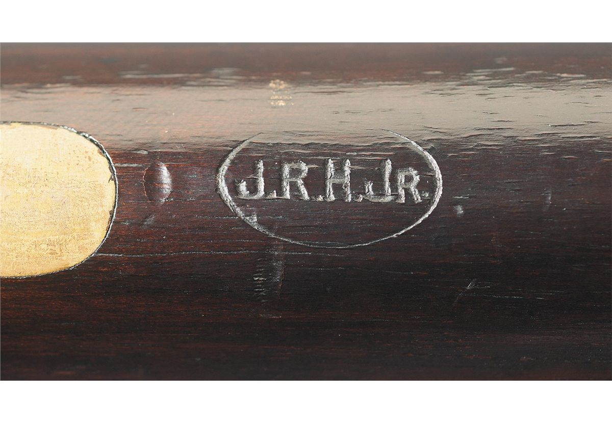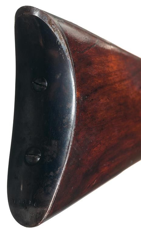 Manufactured c. 1863. The carbine has a 21-inch round .58 caliber barrel, five shot fluted cylinder and brass trigger guard. The barrel has a brass front sight and rear sight with one fixed and two folding leafs graduated for 100, 300 and 600 yards. A staple mounted sling ring is mounted on the left side of the frame. The varnished straight grain black walnut stock has a crescent steel buttplate. The barrel, cylinder and buttplate have a military blue finish. The loading lever and hammer are color casehardened. The top strap is deeply roll-stamped "COL. COLT HARTFORD CT. U.S.A.". "PATENTED SEPT. 10th 1850" is roll-stamped in one cylinder flute. "COLTS PATENT" is stamped in a curve on the left side of the frame above the side plate. London "Crown/V" and "Crown/CP" proof and inspection marks are stamped on the left barrel flat and on the cylinder above each chamber. The initials "J.R.H. JR" are stamped in an oval cartouche on the bottom of the stock behind the trigger guard. This marking was the collection cartouche of J.R. Hegeman, an early collector who was a member of the Colt's Board of Directors circa 1900. The serial number is stamped on the bottom of the frame, trigger guard finial, bottom of the barrel, and heel of the buttplate. Colt manufactured an estimated 2,000 British Carbines with the majority of these having brass buttplates. Examples in excellent condition are rare.
