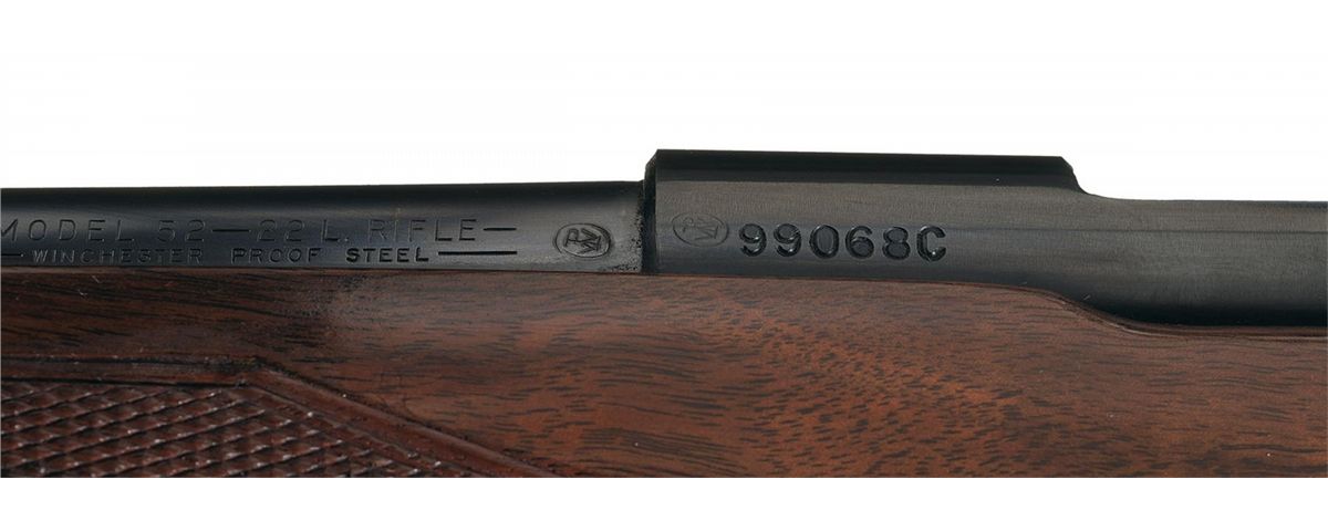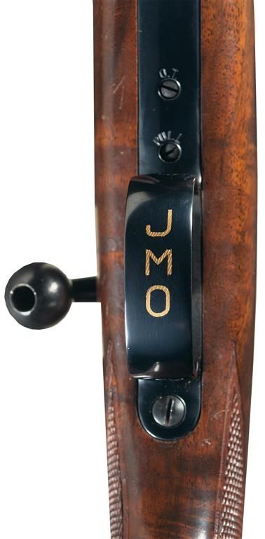 As confirmed by the copy of a letter from Eugene F. Williams, Jr., this rifle was once the personal property of the late John M. Olin. The rifle was manufactured in 1959 and features a hooded ramp front sight and a receiver tapped for scope/sight mounting. The receiver was factory tapped for scope mounts, which is evident by the two Winchester proofs offset to the left side of the barrel and receiver. The trigger guard assembly does not have "sporting" markings due to "O.T." and "Pull" adjustment screws, just like on target M52s. A gold inlaid "JMO" on the trigger guard for John M. Olin. The special order high grade walnut pistol grip stock has checkering on the forearm and grip area, an ebony forend cap, raised cheekpiece, steel grip cap, sling swivel studs and a checkered buttplate.