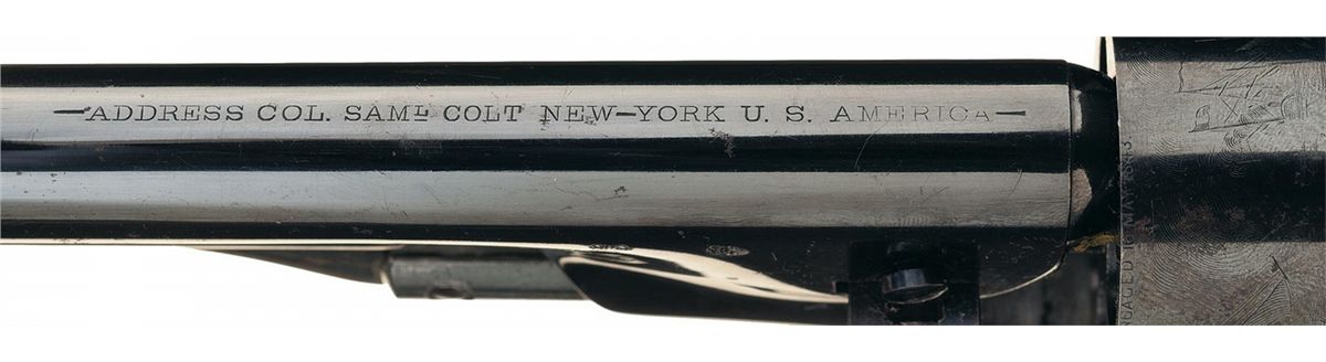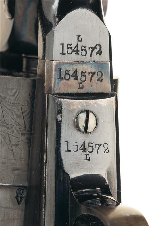 This extraordinary Colt Model 1860 Army Revolver was manufactured in 1865. This Model 1860 Army Revolver is British proofed and has a Colt London address factory oak case with Pall Mall interior label and Colt's/Dixon bag powder flask, oil bottle and cap tin. British cased and proofed Model 1860 Army Revolvers are very rare. The revolver has a high polish blue finish on the barrel, cylinder, trigger guard and back strap. The loading lever, three screw frame and hammer are casehardened with vivid case colors. The one-piece walnut grip has a highly polished piano finish. The top of the barrel is roll-stamped "-ADDRESS COL. SAML COLT NEW-YORK U.S. AMERICA-" in one line. The cylinder is roll engraved with the Texas Navy battle scene and roll-stamped "COLTS PATENT No." "ENGAGED 16 MAY 1843" is stamped in small letters along the forward edge of the cylinder. The left side of the frame is stamped "COLTS/PATENT" in two lines. "44 CAL" is stamped on the left shoulder of the trigger guard. The full serial number "154572" is stamped on the underside of the barrel lug, frame, trigger guard and back strap. The partial serial number "4572" is stamped on the cylinder. All of the visible serial numbers match. An "L" is stamped above the serial number on the lug and below the serial numbers on the frame, trigger guard and back strap. The "L" designation indicates that the revolver was intended for shipment to London. British London "Crown/P" and "Crown/V" inspection and proofmarks are stamped on the left side of the barrel lug and on the rebated portion of the cylinder above each chamber. The revolver features the blue steel trigger guard and back strap that were popular with British customers and hammer spur with bordered knurling. The lid of the British style oak case has brass screws around the edge and round brass plate inlaid in the center. The case has seven compartments and is lined with green baize. A 7 1/2 inch by 5 inch Colt instruction label with "14 PALL MALL LONDON S.W." address and red and black printing is glued to the inside of the case lid. The case contains .44 caliber round balls in the compartment with bone handle lid, steel cleaning rod with turned boxwood knob and slotted shank (COLT ACCOUTREMENTS by Robin Rapley p. 158) blue L-shaped screwdriver/nipple wrench, blue steel .44 caliber bullet mold for round balls and conical bullets with "COLT'S/PATENT" roll-stamped on the top of the sprue cutter in two lines and "44H" on the right block (Rapley M#28, p.137), pewter oil bottle stamped "JAMES DIXON/& SONS/SHEFFIELD" on the bottom (Rapley p. 160), key, "J. Blanch & Son" japanned 500 count cap tin with embossed brass disc (Rapley CT#30, p. 203), and medium size bag-shaped, powder flask with lanyard ring, brown lacquer body, gold-plated brass, three-position charger and niter blue spring marked "COLT'S NAVY FLASK" above the charger and "JAMES DIXON/& SONS/SHEFFIELD" below it (Rapley F#43, p. 108).