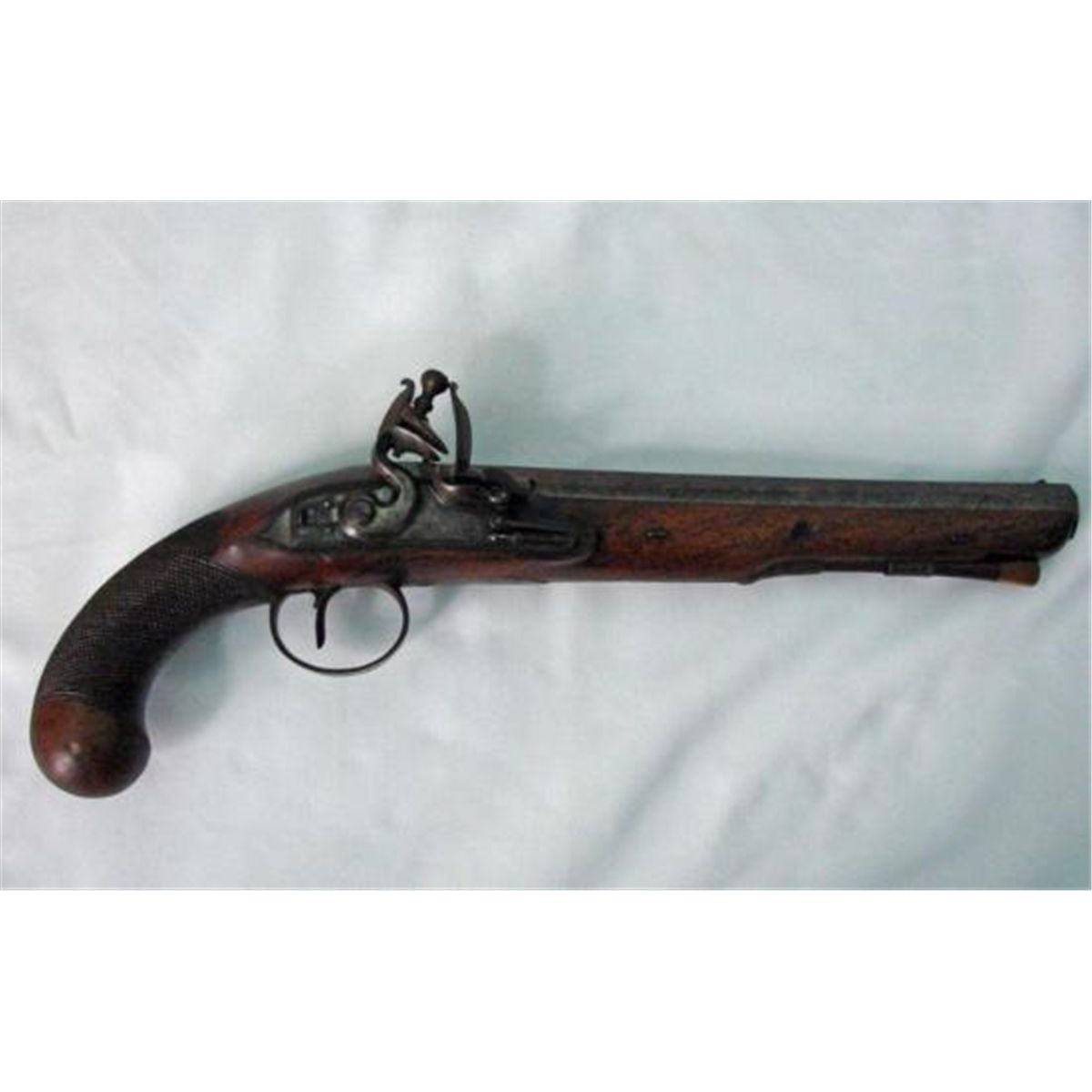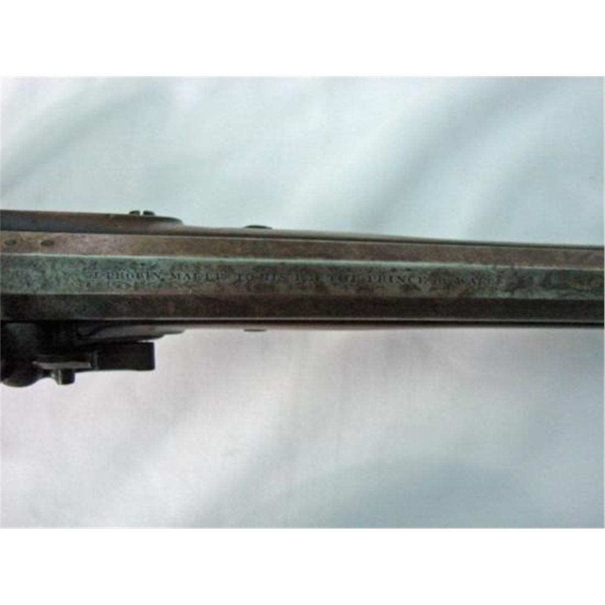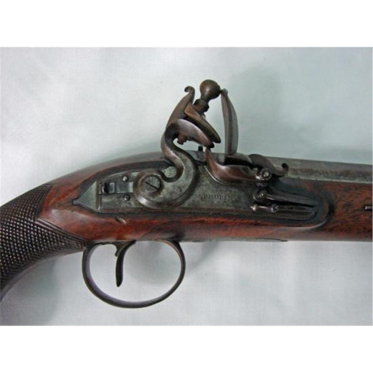 Rare and Fine original carbine calibre full-stock officers flintlock smoothbore pistol with octagon barrel. The maker is renowned as being the gunmaker for the ~Prince of Wales~ and his work is beyond extraordinary. This walnut stocked smooth bore pistol is clearly marked on the lock, with sliding hammer safety, ~J Probin~. the lock-plate is original, not reconverted, mechanically as new, un-mared land retaining a very nice and rich patina. The walnut stock is fine, with perfect, unworn deep hand-checkering. Having a duel purpose, as an officers pistol and dueler, it has both back and a front blade site as well as a set trigger. This fine gun has deep London proof marks and is clearly marked ~J Probin Maker to His R H the Prince of Wales~ The trigger guard sports a pineapple finials. You will find similar pistols at http://www.arbourantiques.co.uk/firearms/probin-pistols/ priced reasonably at $9,560.00 The quality and condition of this pistol is equal if not better and estimated between $7,500 and $9,500