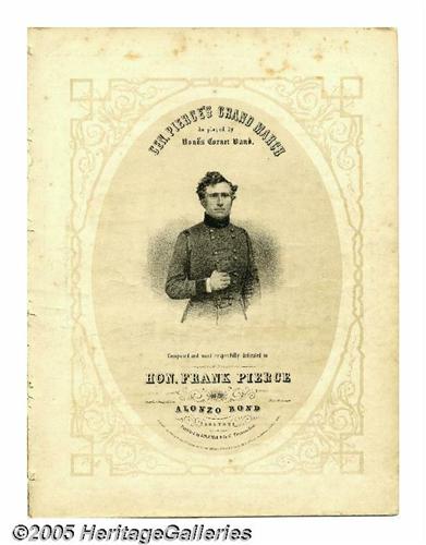 <B>Rare and Graphic Franklin Pierce Campaign Sheet Music</B></I> 10" x 13" sheet music published by George Reed in Boston in 1852, titled "Gen. Pierce's Grand March As played by Bond's Cornet Band. Composed and most respectfully dedicated to Hon. Frank Pierce." Pierce is shown in his Mexican War uniform, striking a Napoleonesque pose. Cover is printed in beige and black. Disbound from album, as is normal, six pages in very decent condition. How much Franklin Pierce music do you see? Lot:256