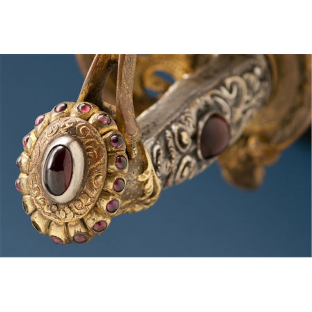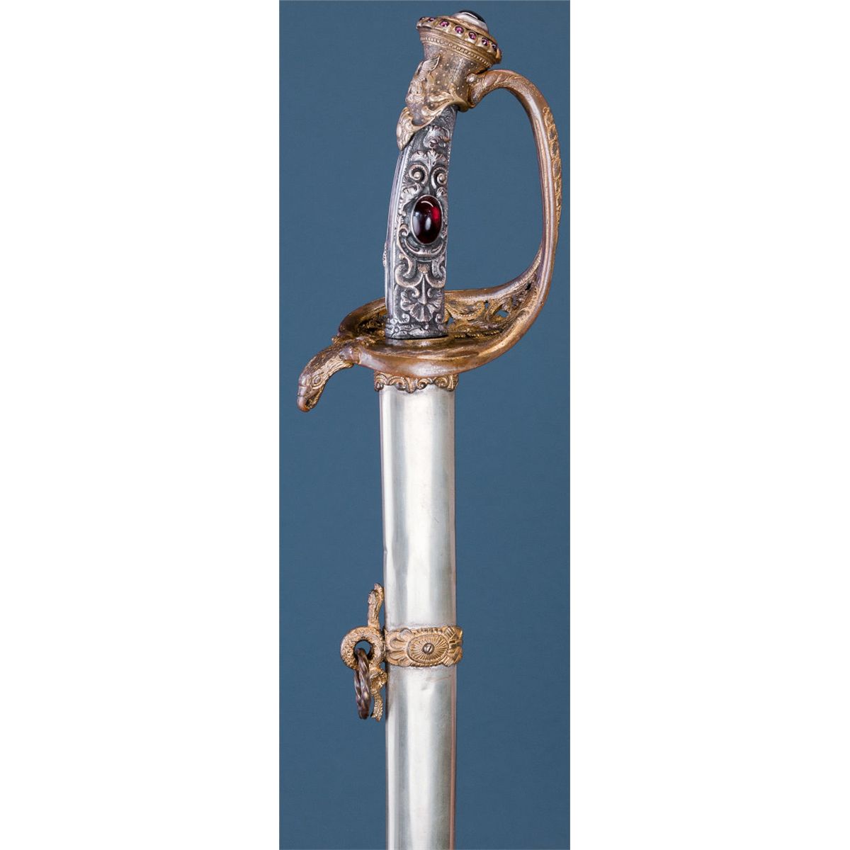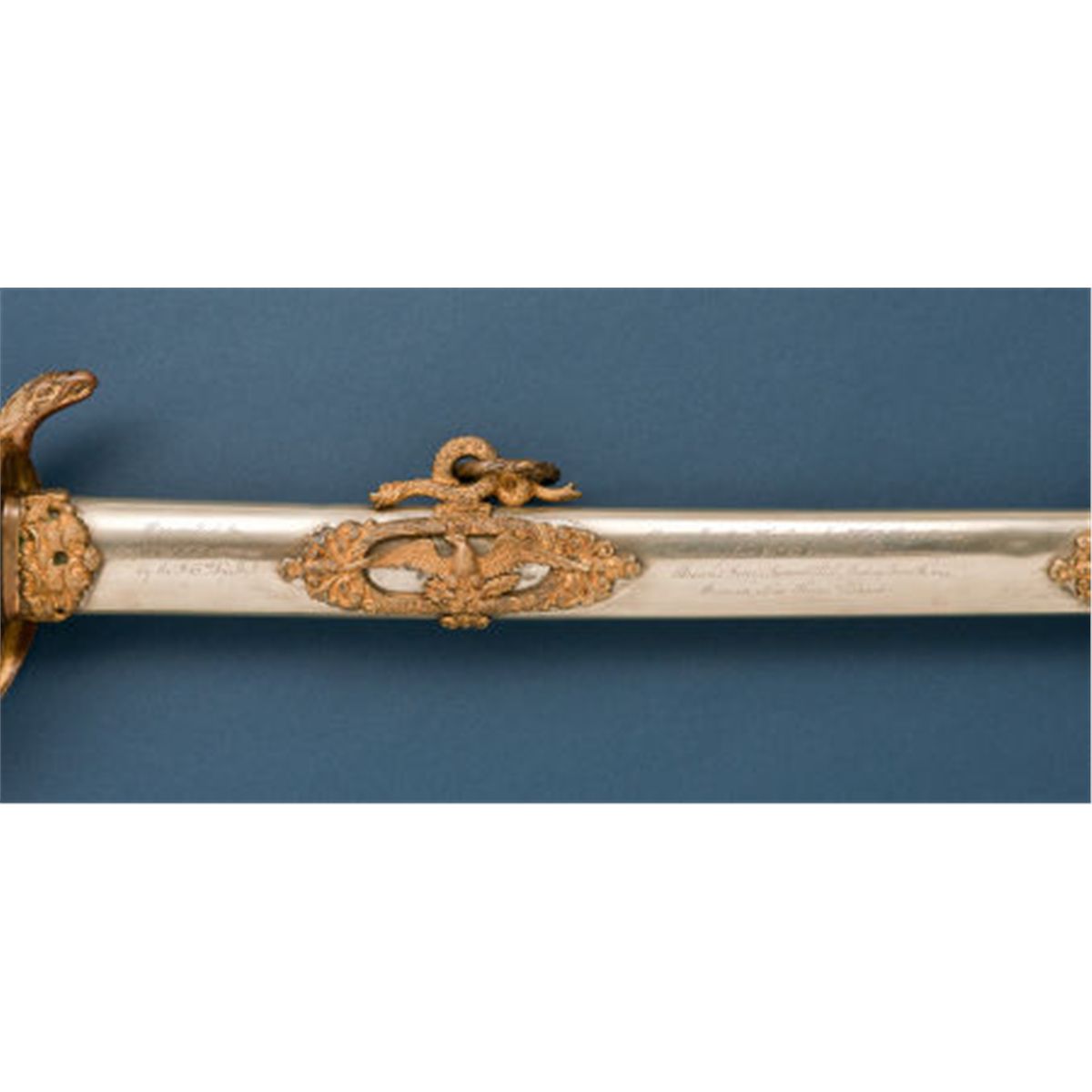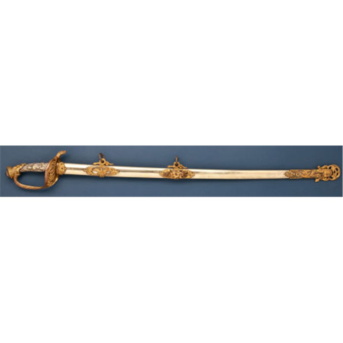 Rare and Historic Presentation "We Never Surrender" Civil War Model 1850 Staff & Field Officer's Sword by W. Clauberg, Presentation Inscribed to Captain Thomas Hardeman from Company F, 55th Kentucky Mounted Infantry, with Battle Honors. 32 ¾-inch slightly curved blade, the left side etched with panoplies of arms, floral scrolls, interlocking U.S. monogram and a panoply of flags. Single wide fuller. Ricasso marked: W. Clauberg/Solingen. Right side with gladius flanked by garlands and boughs, a panoply of arms, bold legend in Old English reading: "We Never Surrender" surrounded by floral scrolls, below a U.S. monogram and a panoply of flags. Four different patriotic eagle motifs grace the sides of the blade. Top of back edge etched with floral meander and bearing legend: Iron Proof. Gold-gilded brass hilt, the front guard pierced with a finely rendered American eagle surrounded with ornate floral scrolls and roped borders. Handsome and unique eaglehead quillon. The back edge of knucklebow with shaft of wheat. Silver-plated relief cast grip, the left side with sculpted scrolls surrounding a ruby-red transparent oval cabochon. Right side adorned with a deep-relief Goddess of Liberty under a cluster of stars and holding a Union shield. The pommel depicts an American eagle surrounded by deeply carved floral scrolls and capped with an ornate three-tiered oval, the rouletted outer ring mounted with 16 ruby-colored stones and topped with a transparent deep red oval cabochon. The fine German Silver scabbard bears the presentation inscription: Presented to Capt. Thos. Hardeman/By Co. F. 55th Ky. M. I. Also inscribed with the following battle honors: Round Mountain, Woodbury, Aug. 28th '62. Stone River./ Jan. 25th '63, Graysville, Chickamauga,/Brown's Ferry, Tunnel Hill, Rockey Face Ridge/Resaca, New Hope Church. Finely cast three dimensional gilt brass mountings, the throat with delicate floral scrolls, the top ring mount with finely detailed American eagle, pierced and surrounded by an oval frame of floral scrolls and topped with a ring mount in the form of a sea serpent with a twist hanging ring. The central ring mount depicts a sculpted and pierced panoply of flags with a reprise of the serpent and ring mount motif. The lower mount with a Union soldier in relief, flanked with American flags and surrounded by a roped border with roped lacework above. The drag is an ornate scroll, pierced with grape leaves and inner roped border. All are gilt finished. A beautiful and well appointed officer's Civil War presentation sword from a documented owner who was wounded in action and bearing the inscribed record of his participation in many historic battles.Captain Thomas Hardeman rose quickly through the ranks of the 23rd Kentucky from December of 1861 through October of 1864 and was cited for gallant conduct at Chickamauga. During his term with the 23rd, Hardeman saw action in most every encounter with the enemy to include the battle honors inscribed on this sword. He was eventually wounded by gunshot at Dallas, Georgia during the Atlanta campaign and discharged for disability. After recovery, he was commissioned an officer in Company F of the 55th Kentucky Mounted Infantry. Unlike most presentation swords, this one appears to have been proudly carried by Hardeman in the field, the remainder of the war.The 55th Kentucky Mounted Infantry regiment was raised under special authority from the war department and was organized at Covington, Kentucky in November of 1864. On the Saltville expedition it performed good and efficient service and was favorably mentioned by the commanding general, among other troops in his division, for gallant bearing in the face of the enemy.Condition: Good to very good. Blade showing wear and grey patina with tiny light spots of pitting present but with all of its etched motifs showing. The hilt with wear to gilt and age patina present. The hilt and scabbard mounts showing surface wear, aged patina and generous amounts of original gold gilt finish.